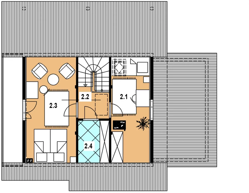 Мансарда дома 6х10 одноэтажный с мансардой добавляет полезную площадь и включает две спальни (13 и 17,3 м²), коридор и хозяйственное помещение. Эта зона идеально подходит для детей, кабинета или гостевой комнаты, обеспечивая приватность и комфорт.