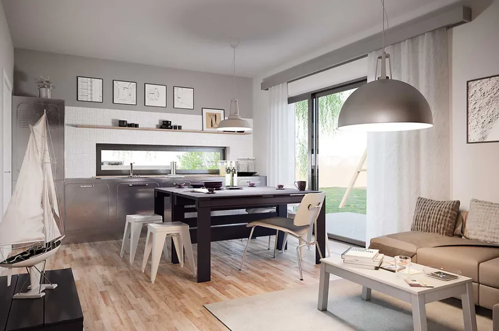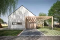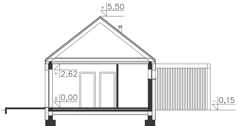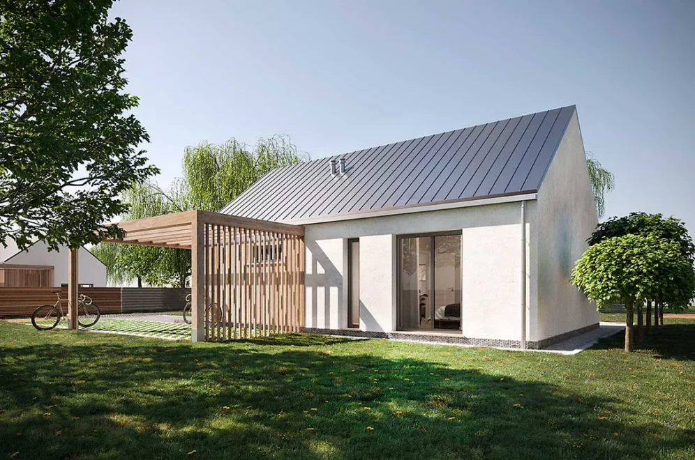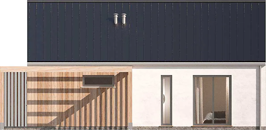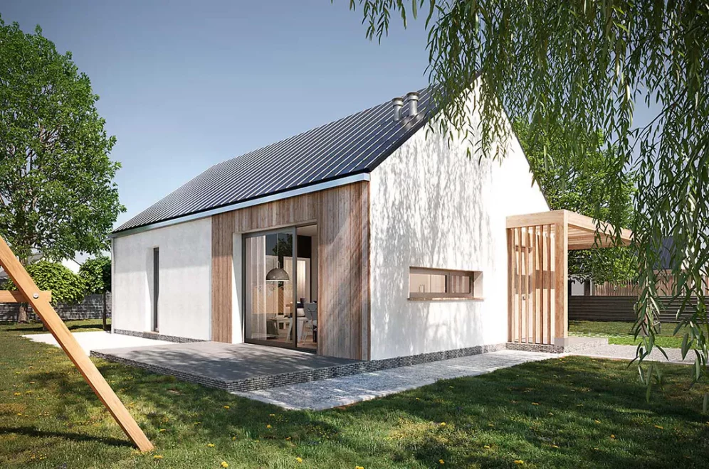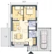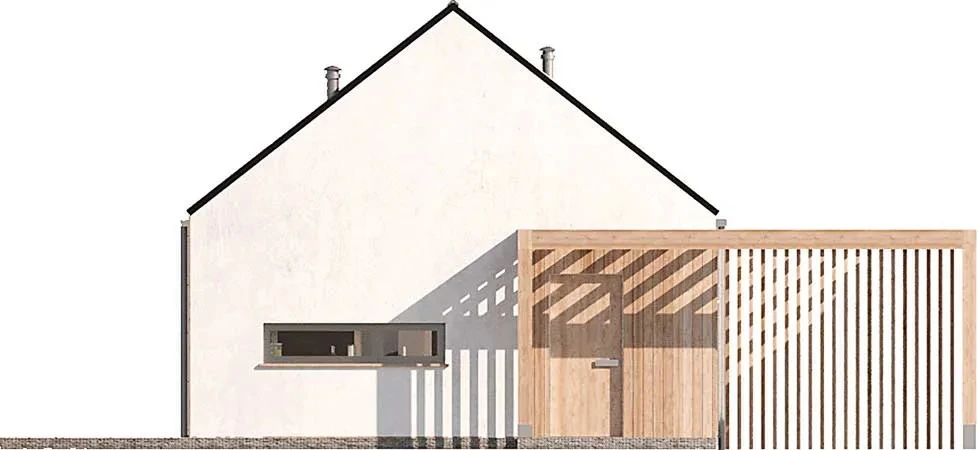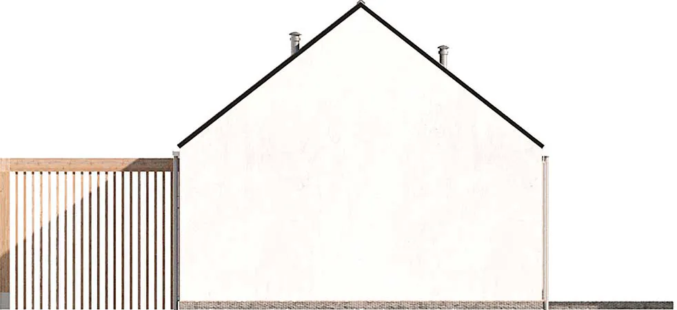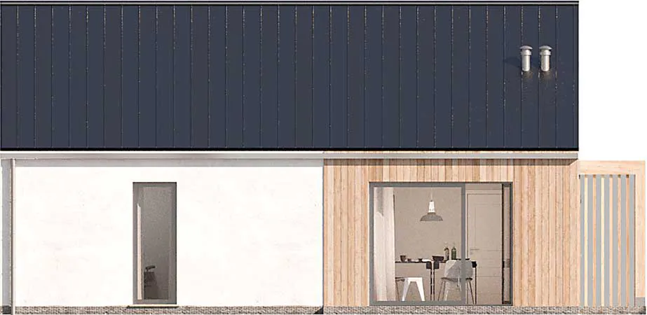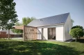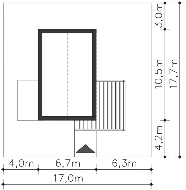 Простая прямоугольная форма здания и двускатная крыша с углом наклона 38° обеспечивают быстрое и недорогое строительство. Высота здания 5,65 м, фасадные размеры — 6,7×10,5 м, минимальные размеры участка — 17×17,7 м.