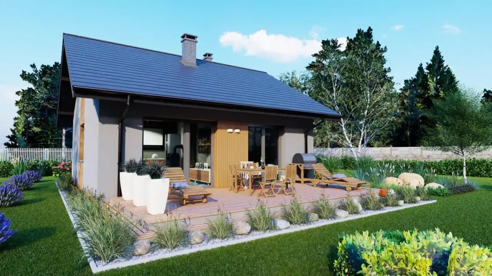 Дом AET-169 — это каркасный дом 8х8 одноэтажный проект с удобной планировкой, подходящий для постоянного проживания и дачи. Он сочетает компактность и функциональность, а прочная конструкция обеспечивает долговечность и энергоэффективность. Терраса или открытая зона перед домом позволяет наслаждаться отдыхом на свежем воздухе, а традиционный внешний вид гармонично вписывается в любой ландшафт. Этот проект станет отличным выбором для семьи из 3–5 человек.