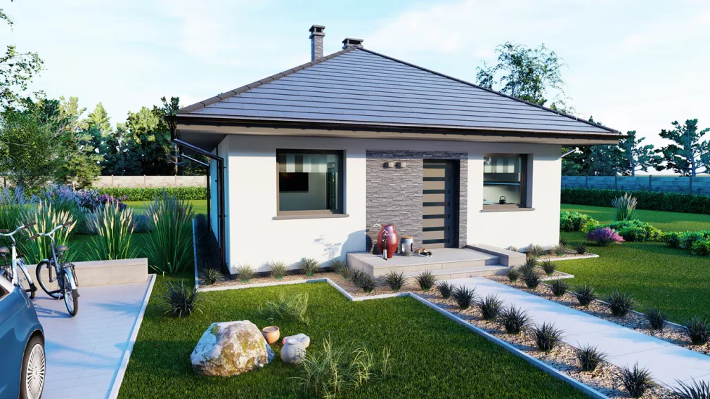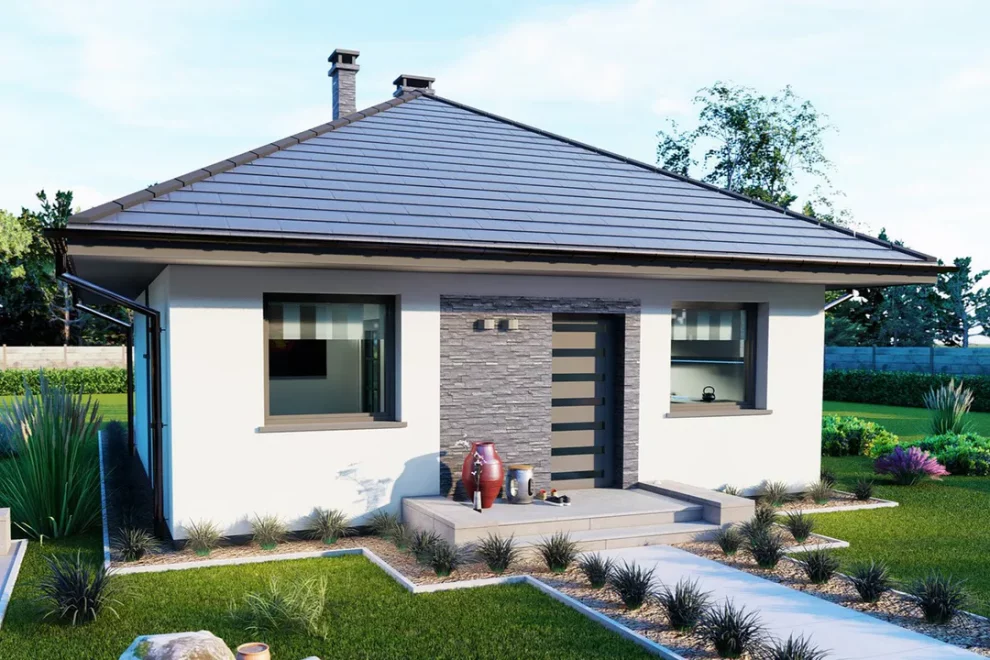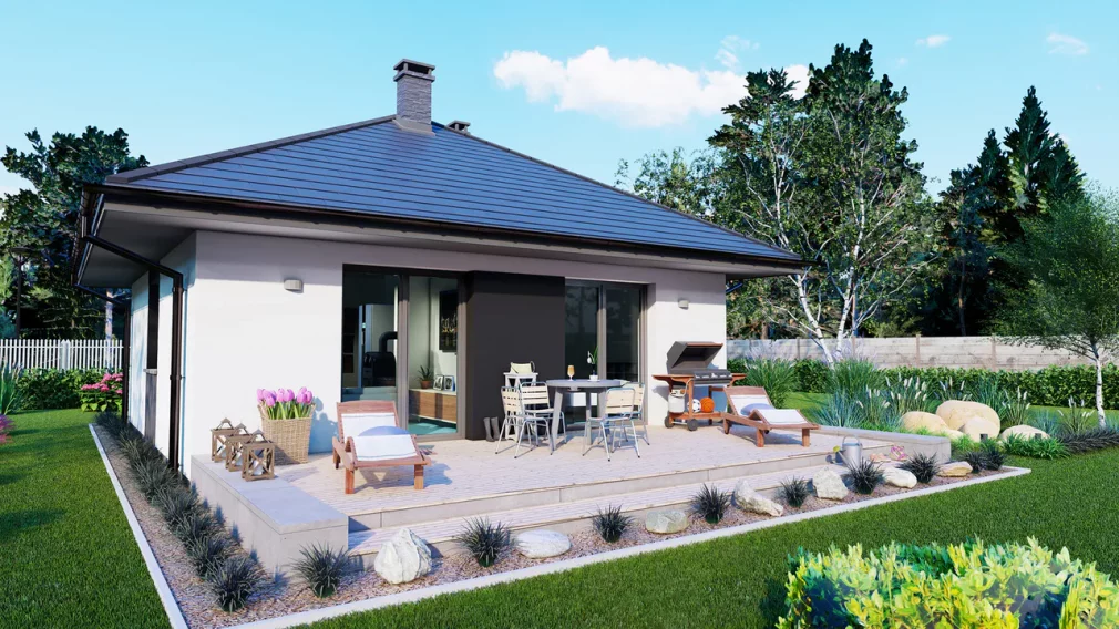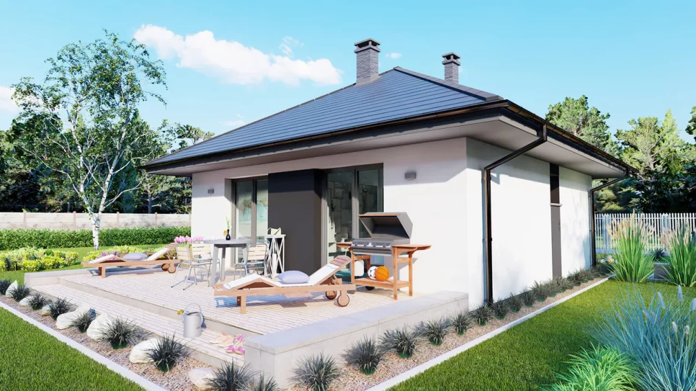 Проект дома 171 — это одноэтажный каркасный дом 8 на 8, который сочетает компактность и функциональность, идеально подходя для узких или стандартных участков. Дом имеет продуманную планировку, где гостиная с кухней и обеденной зоной образует просторную дневную зону, обеспечивая удобство для семейных вечеров и общения. Внутри также предусмотрены несколько спален и ванная комната, что делает дом комфортным для семьи из 3–4 человек.