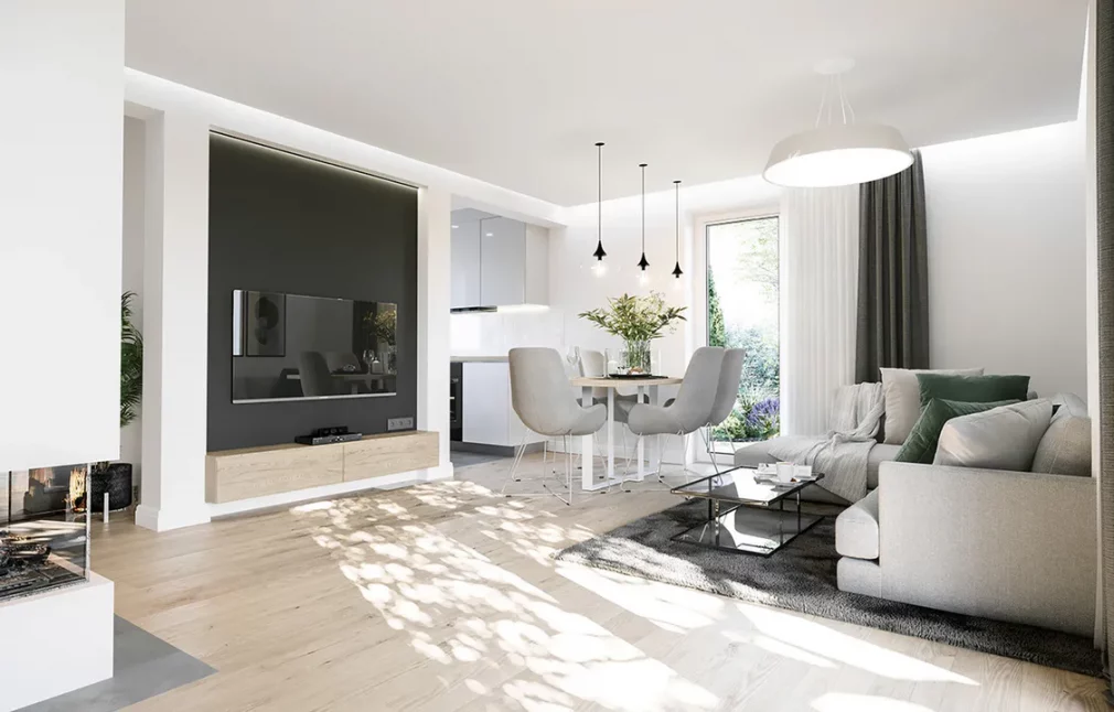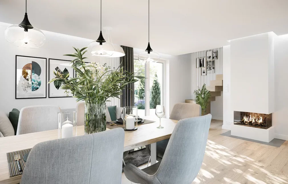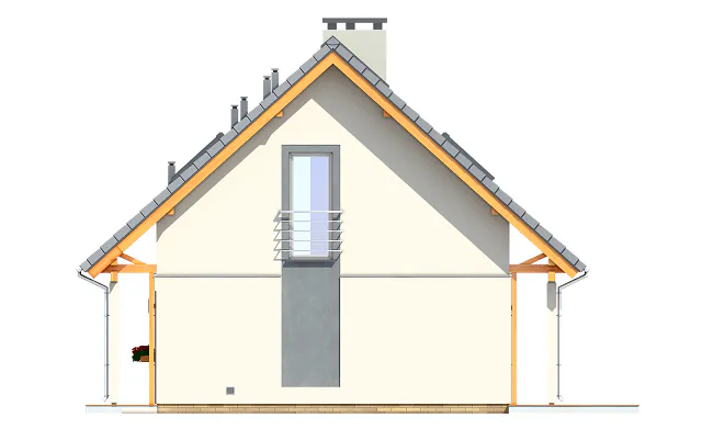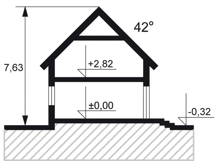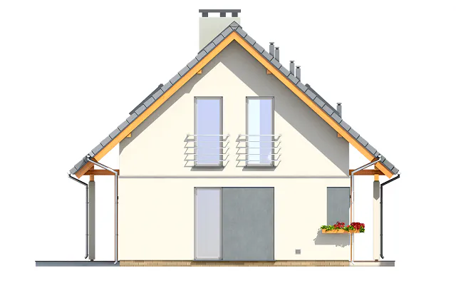 Архитектура выполнена в традиционном стиле с двускатной крышей, что делает здание гармоничным и универсальным. Это проект одноэтажного дома с мансардой, где дневная и ночная зоны чётко разделены. Просторная гостиная с камином и открытой кухней создаёт атмосферу уюта, а три спальни на мансарде обеспечивают приватность и комфорт.