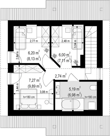Каркасно-панельный дом с мансардой AET-184Общая площадь110 м²Жилая площадь67,15 м²Высота карниза0,75 мПлощадь застройки55 м²Стоимость от4 419 000 руб