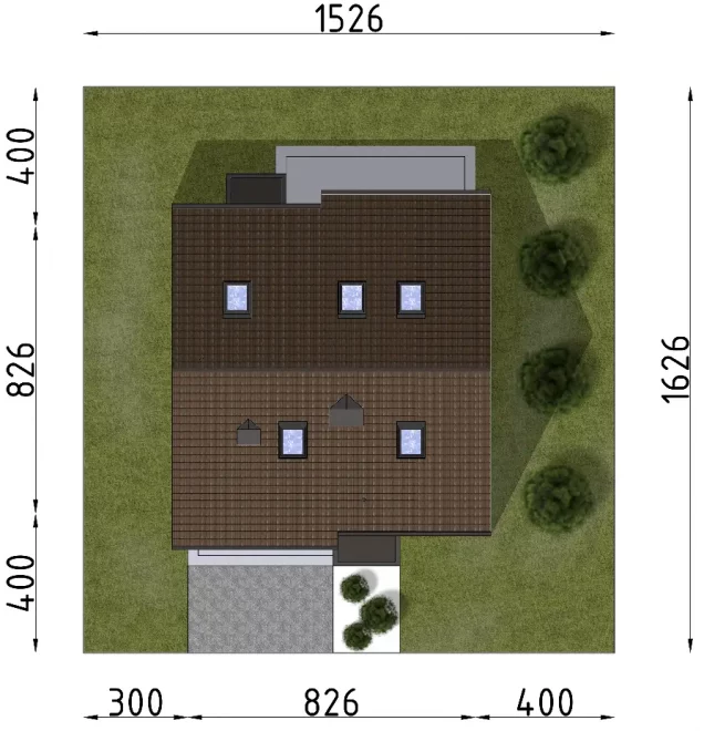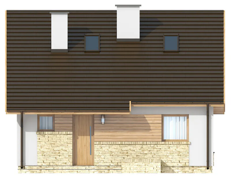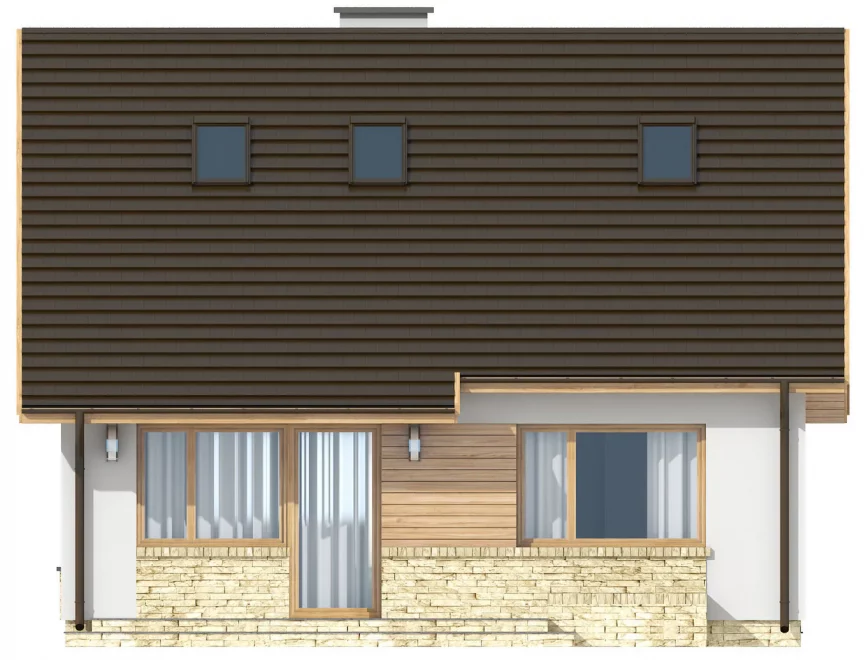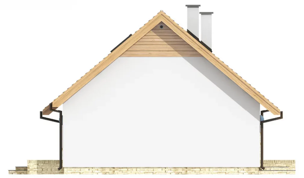 Дом спроектирован с двускатной крышей, конёк которой расположен параллельно дороге — это удобно при соблюдении градостроительных норм. Проект рассчитан на отдельностоящее строительство, но при необходимости может быть реализован как дом-близнец, если разместить его у границы участка.