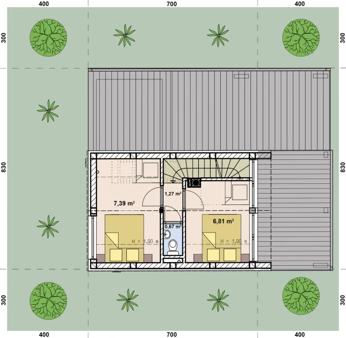 Мансардный этаж образует тихую зону отдыха, где размещены две спальни, туалет и небольшой холл. Такое зонирование обеспечивает приватность и удобство для всех членов семьи.