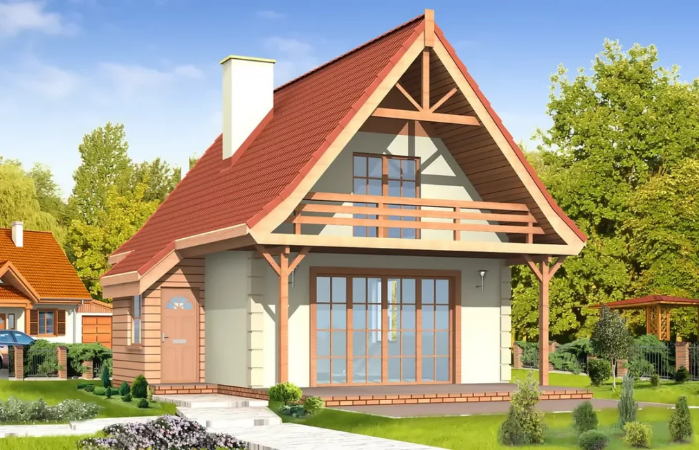 Проект одноэтажного дома с мансардой подойдёт для семей из 3–4 человек. Его компактные размеры делают возможным размещение даже на небольшом участке, при этом внутри дом остаётся просторным и светлым.