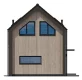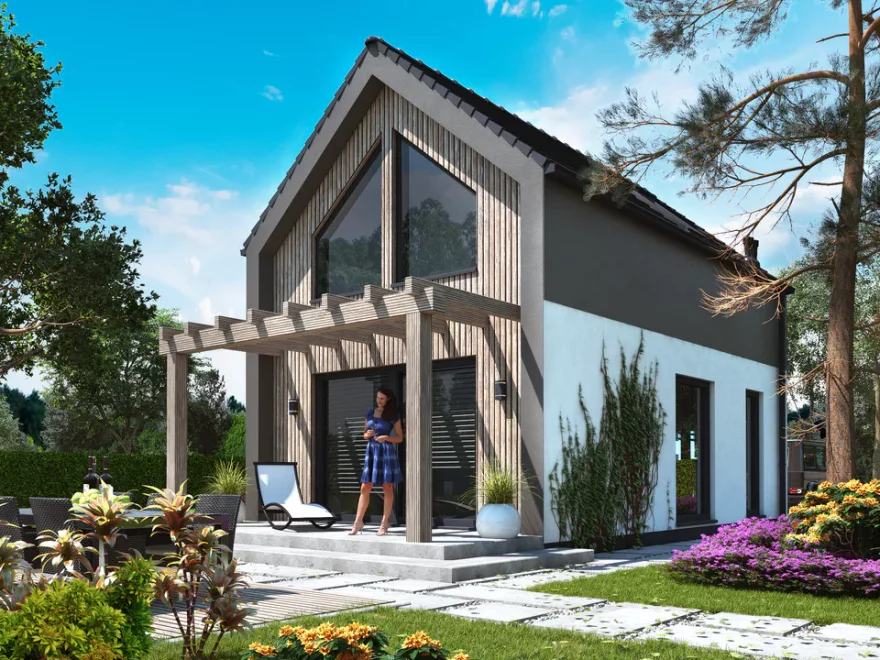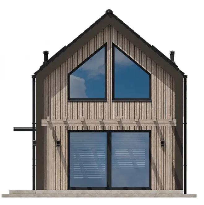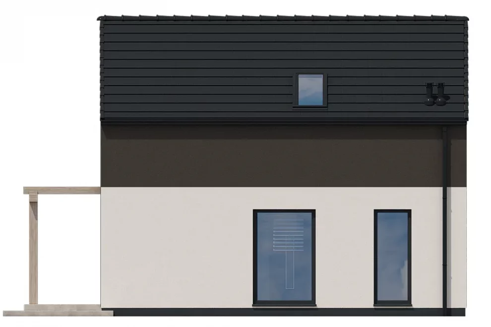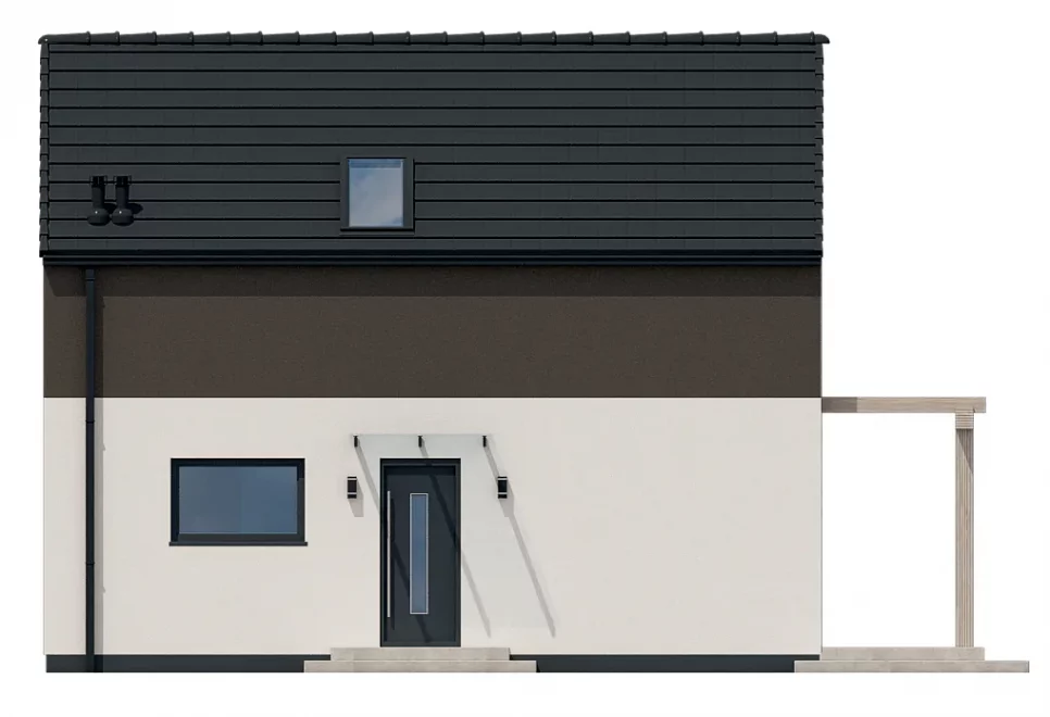 Проект дома AET-185 представляет собой современный, компактный и функциональный дом с жилой мансардой, рассчитанный на круглогодичное проживание. Здание имеет квадратную форму, фасад сочетает светлую и графитовую штукатурку с вертикальными деревянными элементами, а двускатная крыша с углом наклона 40° придаёт дому классический и гармоничный вид.