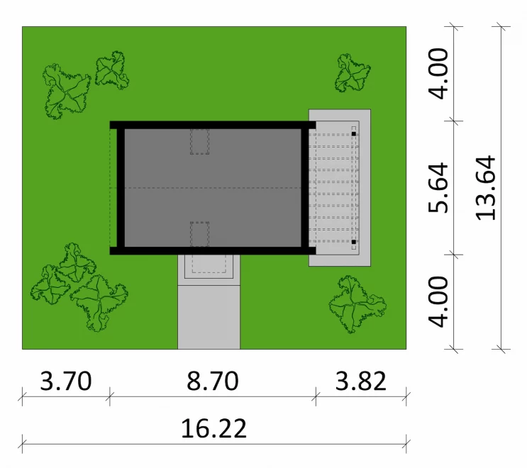 Общая площадь дома составляет 92,17 м², жилая площадь — 54,38 м², площадь застройки — 46,10 м², площадь крыши — 64,03 м². Дом высотой 7,05 м, ширина фасада — 8,70 м, длина фасада — 5,64 м. Компактные размеры позволяют рационально использовать участок, что делает проект удобным для средних и узких участков.