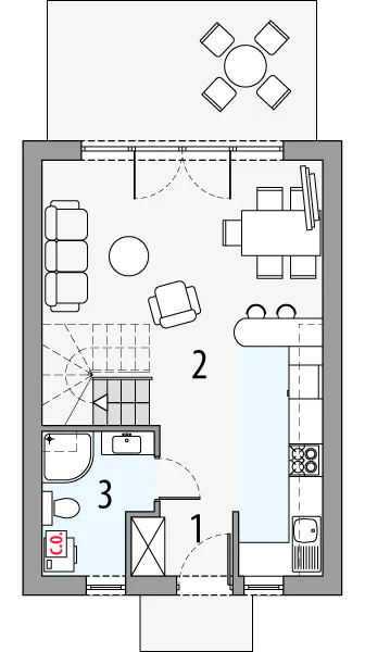Дом рассчитан на узкие участки и отличается компактными габаритами фасада, что делает его универсальным решением для строительства. Такая терраса станет уютным продолжением дневной зоны, где можно организовать место для отдыха на свежем воздухе.