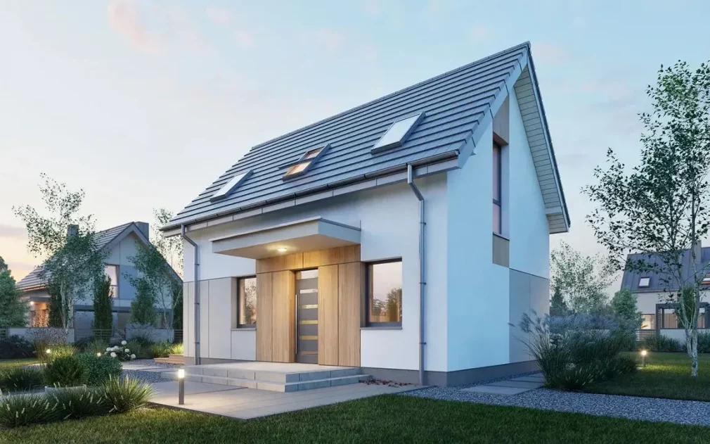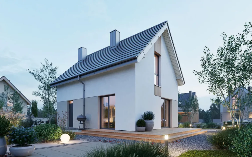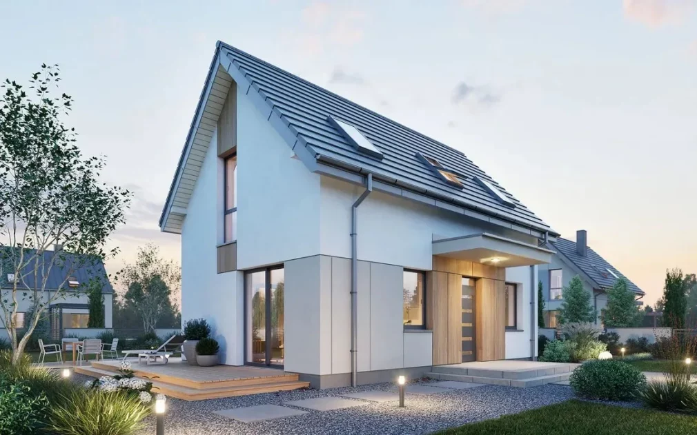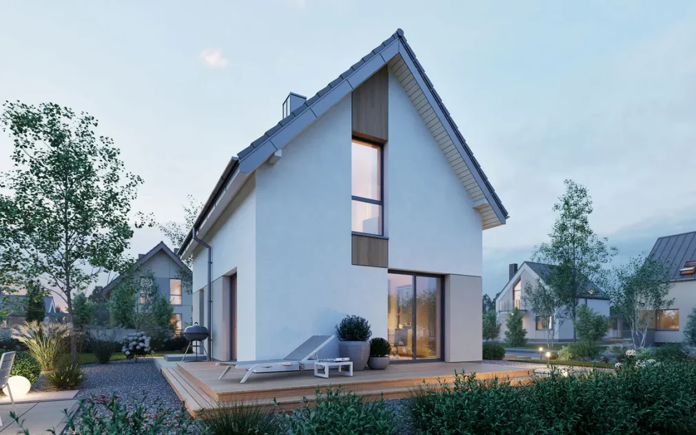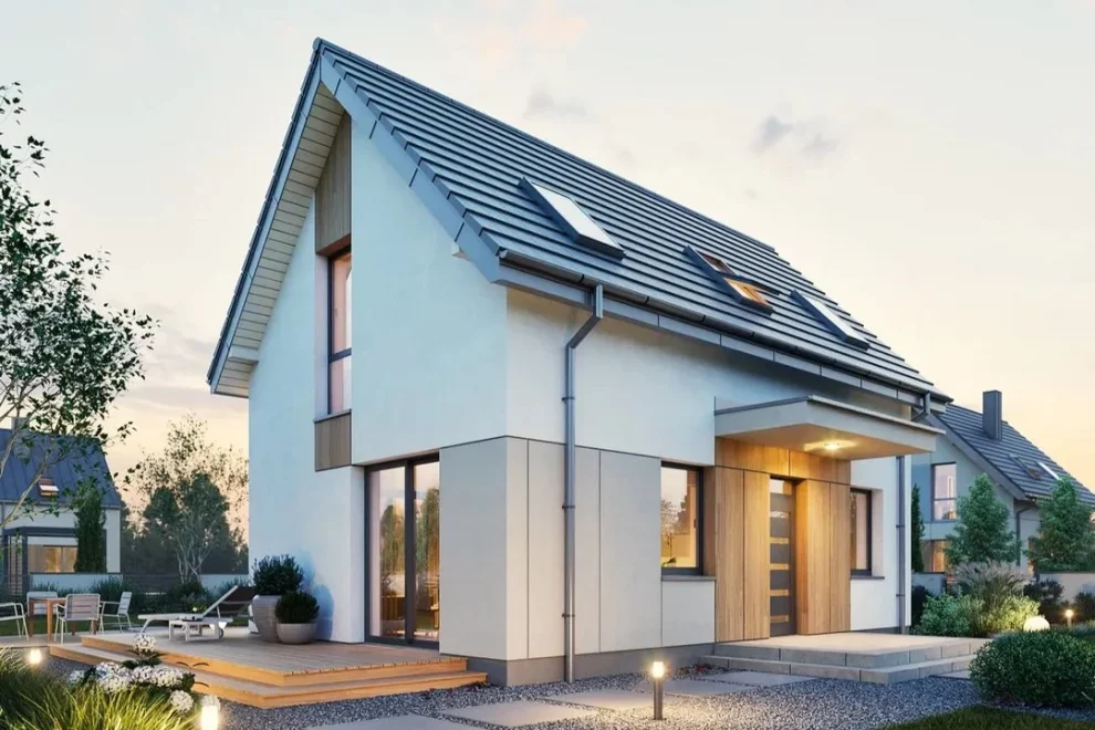 Проект AET-189 — современный проект дома с мансардой и террасой, идеально подходящий для небольшой семьи. Дом сочетает компактность, функциональность и стильную архитектуру с простой формой и двускатной крышей.