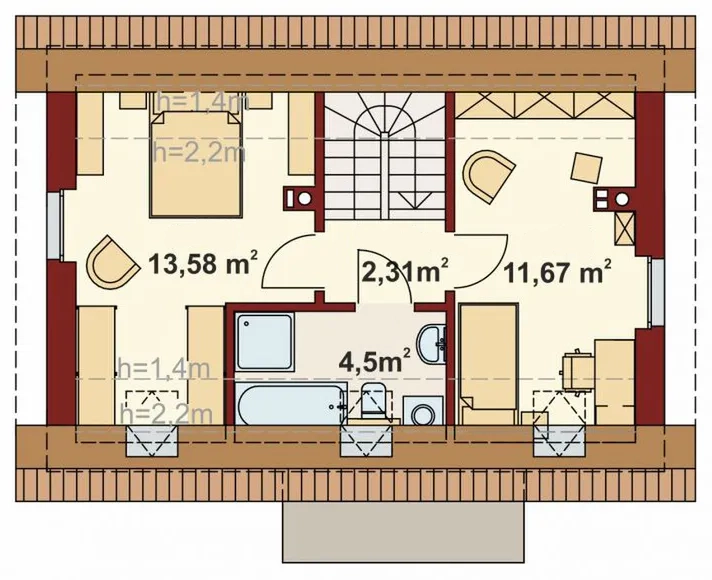 Мансарда превращается в полноценную ночную зону с двумя спальнями, одна из которых оборудована местом для гардероба, а отдельная ванная комната обеспечивает комфорт и приватность.
