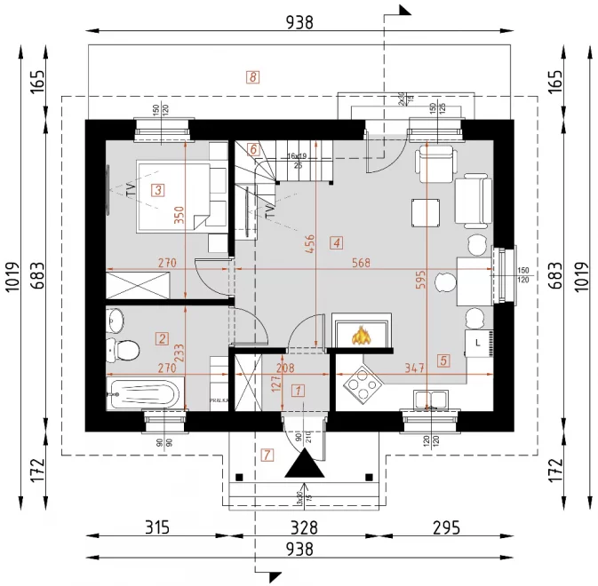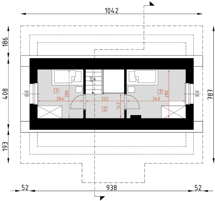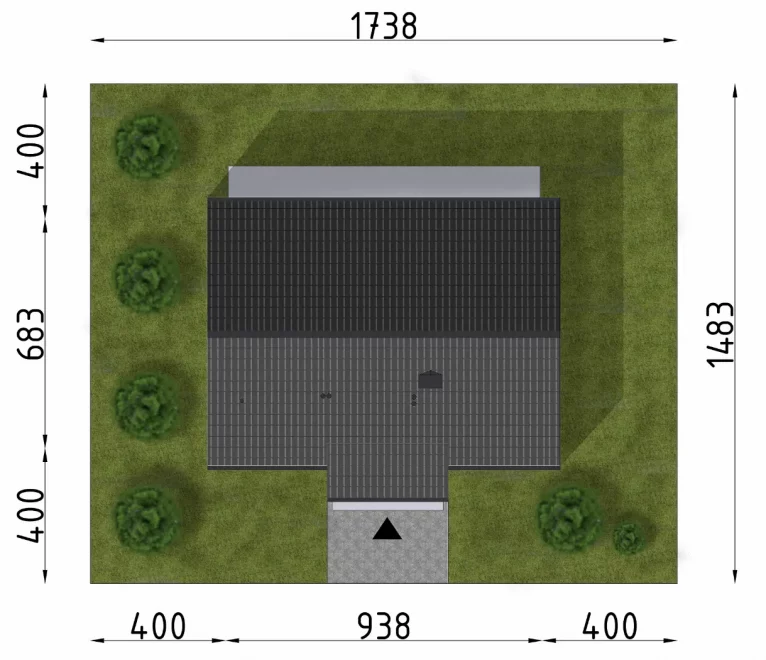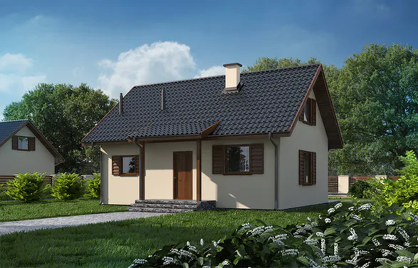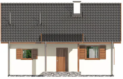 Проект AET-192 — компактный и функциональный одноэтажный дом с террасой проект с мансардой, идеально подходящий для семей, ценящих уют и рациональное использование пространства. Дом имеет простую форму и двускатную крышу с коньком, расположенным параллельно дороге, что облегчает строительство и отвечает современным градостроительным требованиям.