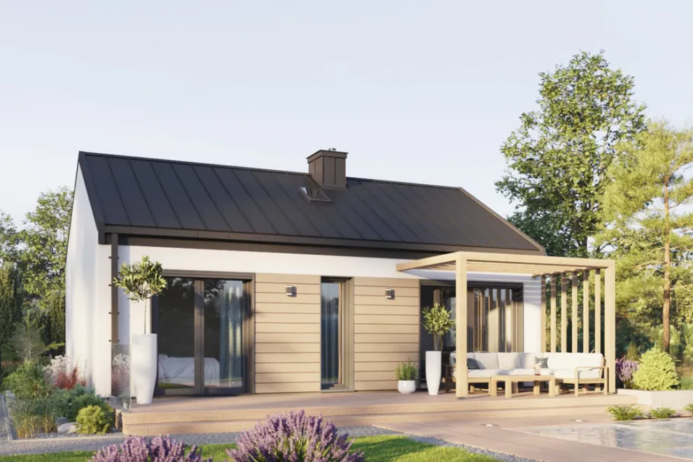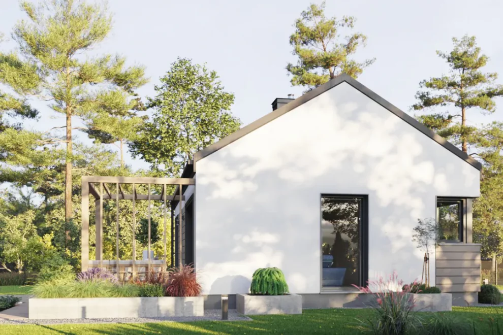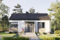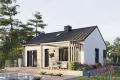 Внутри расположена дневная зона, объединяющая гостиную с кухней, создавая уютное пространство для семейных встреч. Две отдельные комнаты можно использовать как спальни или рабочие кабинеты. Летнее пространство расширяется благодаря террасе с прямым выходом из гостиной, превращая дом в гармоничное сочетание интерьера и открытой зоны отдыха.