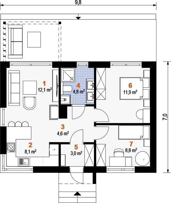 Проект является отличным примером одноэтажного дома с террасой, а также удачным проектом дома с террасой и современным одноэтажным каркасным домом с террасой, где минимализм, комфорт и функциональность гармонично сочетаются.