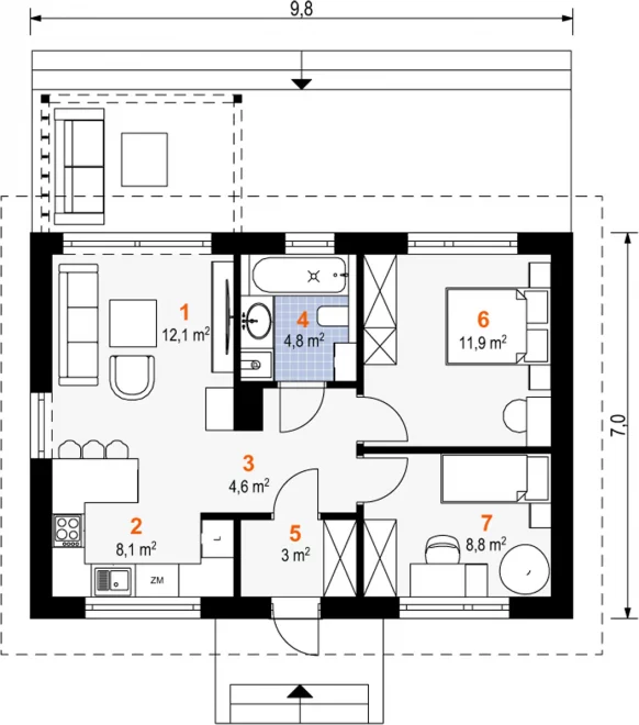 Дневная зона объединена с кухней, образуя удобное пространство для отдыха. Такое планировочное решение нередко привлекает владельцев участков, которым нужен проект одноэтажного дома 100 м2, ориентированный на уют и рациональность. Гостиная получает достаточно естественного света, а прямой выход на террасу создаёт ощущение расширенного пространства.