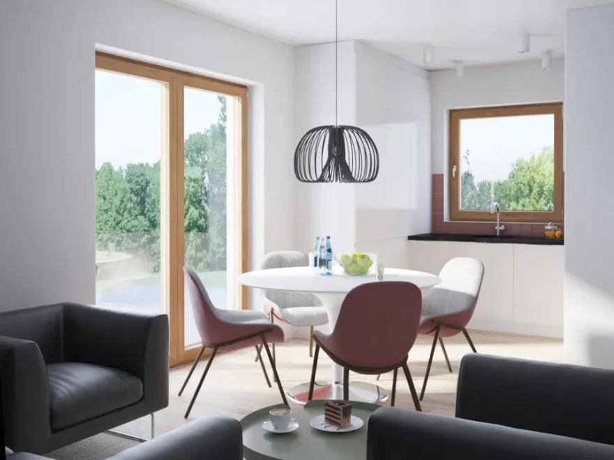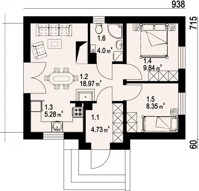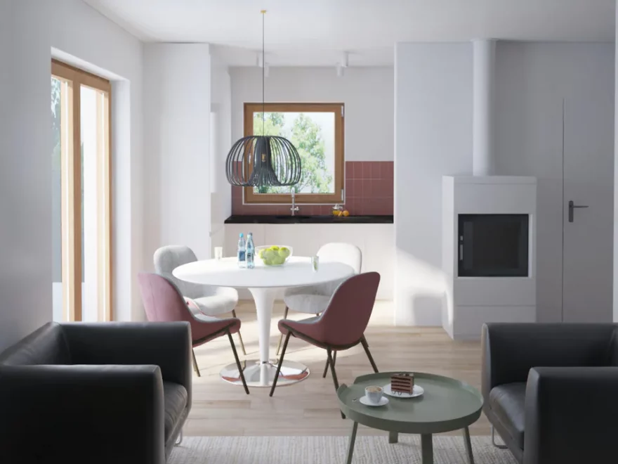 Дневная зона объединяет гостиную и кухню, создавая простор для семейных встреч и хозяйских задач. Спальные помещения расположены в приватной зоне, что обеспечивает спокойный отдых для всех жильцов.