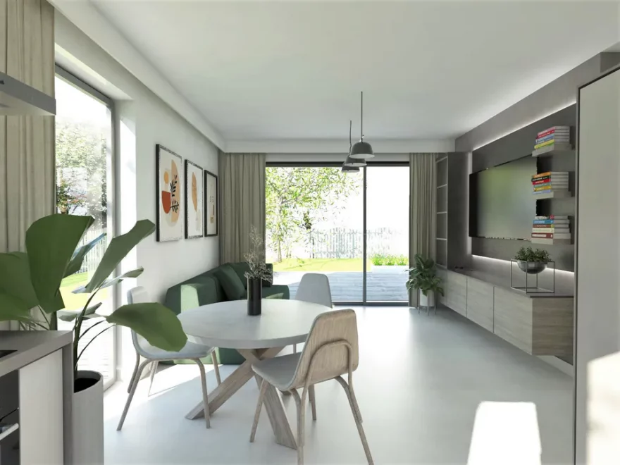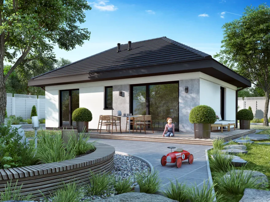 Проект AET-204 выполнен в современном стиле и подходит тем, кто рассматривает проекты домов одноэтажных до 100 как практичное и комфортное решение для постоянного проживания. Дом имеет чёткую геометрию и спокойный архитектурный облик, что позволяет ему органично вписываться в различные типы участков.