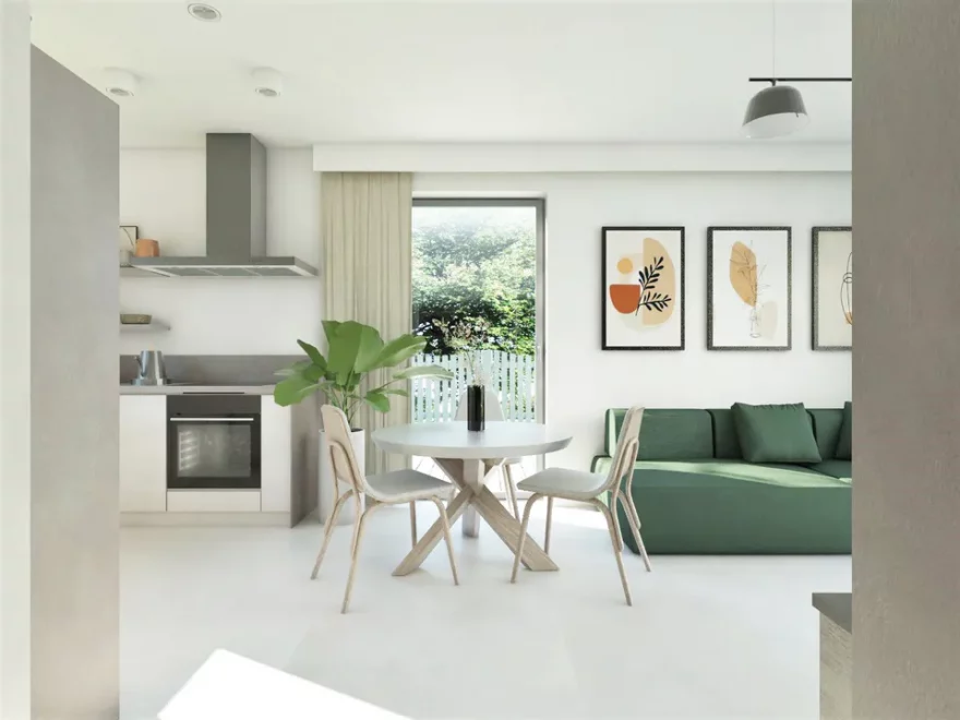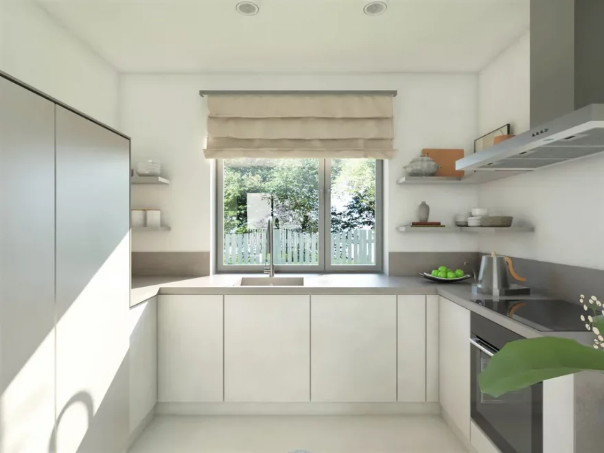 Внутреннее пространство строится вокруг открытой общей зоны, где объединены кухня, обеденная часть и гостиная. Такое решение создаёт удобное место для общения, что особенно привлекательно для тех, кто изучает проекты домов до 100 кв м и ценит функциональность в каждом элементе дома. В сторону приватной части вынесены две отдельные комнаты, обеспечивающие комфорт жильцам любого возраста.