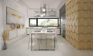 Центральная дневная зона площадью более 20 м² объединяет гостиную, столовую и кухню, обеспечивая удобство для совместного отдыха и приёма гостей. Кухня площадью 14,81 м² дополнена кладовой, что делает хранение продуктов и бытовой техники максимально удобным. Прямой выход из дневной зоны на террасу создаёт ощущение единства с садом и открывает возможности для организации отдыха на свежем воздухе. Такое решение характерно для проектов домов с плоской крышей, подчёркивающих современный минимализм.