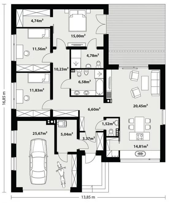 Проект AET-211 — это современный одноэтажный дом с плоской крышей, созданный для семьи из четырёх человек, где функциональность и комфорт гармонично сочетаются с элегантной архитектурой. Дом выделяется продуманной планировкой, рациональным использованием пространства и светлыми, просторными комнатами.