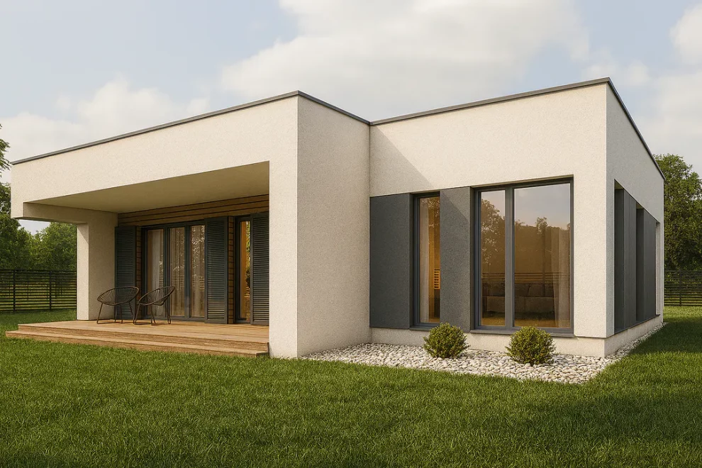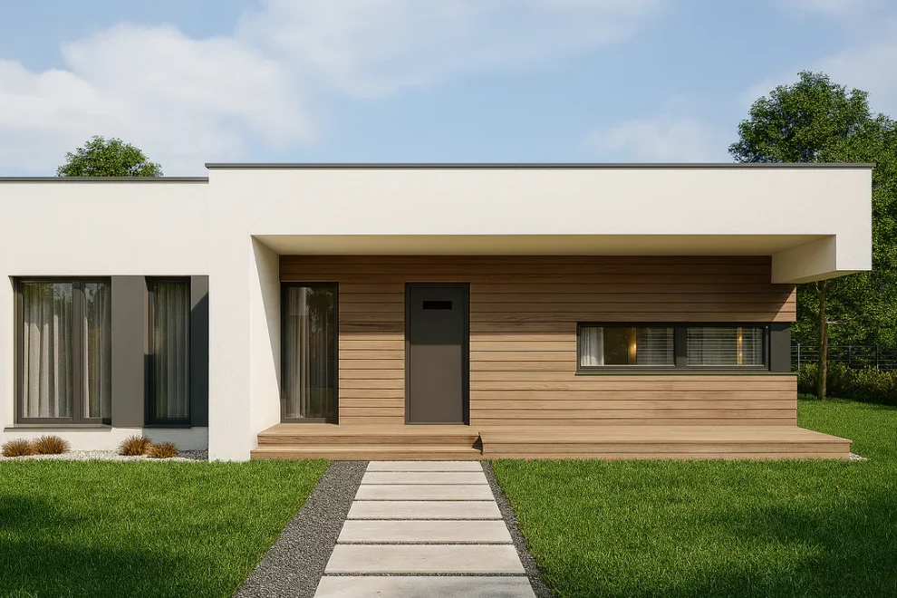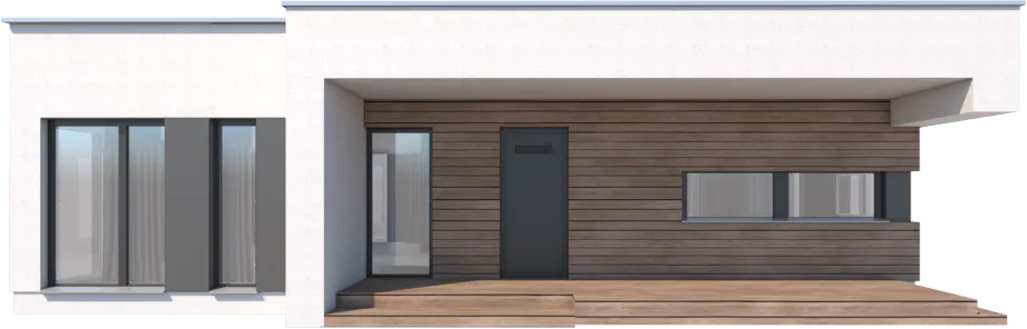Проект AET-212 — это современный одноэтажный дом с плоской крышей, созданный для семьи из 2–4 человек и идеально подходящий для участков средней ширины. Простая, лаконичная форма дома обеспечивает лёгкость строительства, а рациональная планировка делает проживание максимально комфортным.