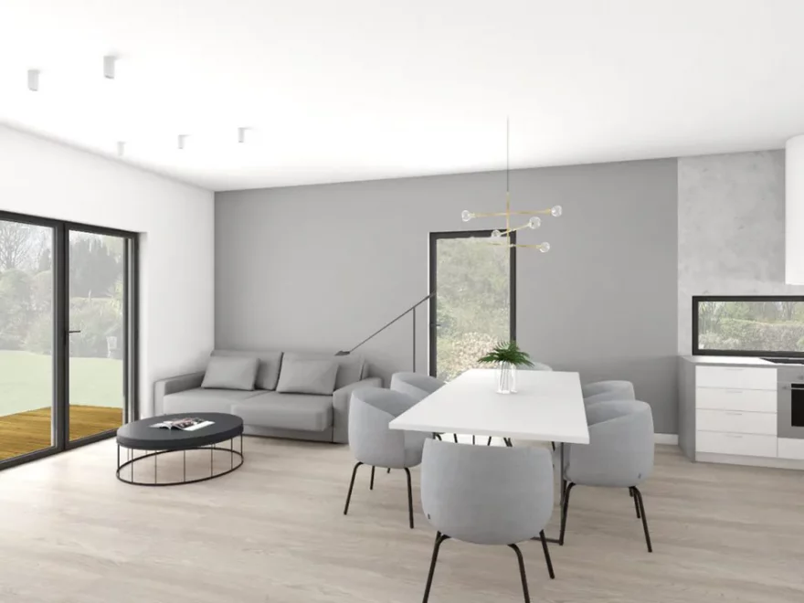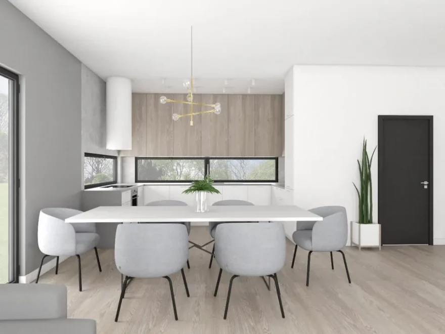 Сердцем дома является просторная дневная зона площадью 30 м², объединяющая гостиную и столовую. Панорамные окна и прямой выход на террасу создают ощущение единства с садом и позволяют проводить время на свежем воздухе. В гостиной установлен камин, который придаёт интерьеру уют и гармонию. Такое решение характерно для проектов домов с плоской крышей, подчёркивающих современный минимализм и функциональность.