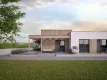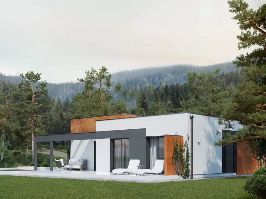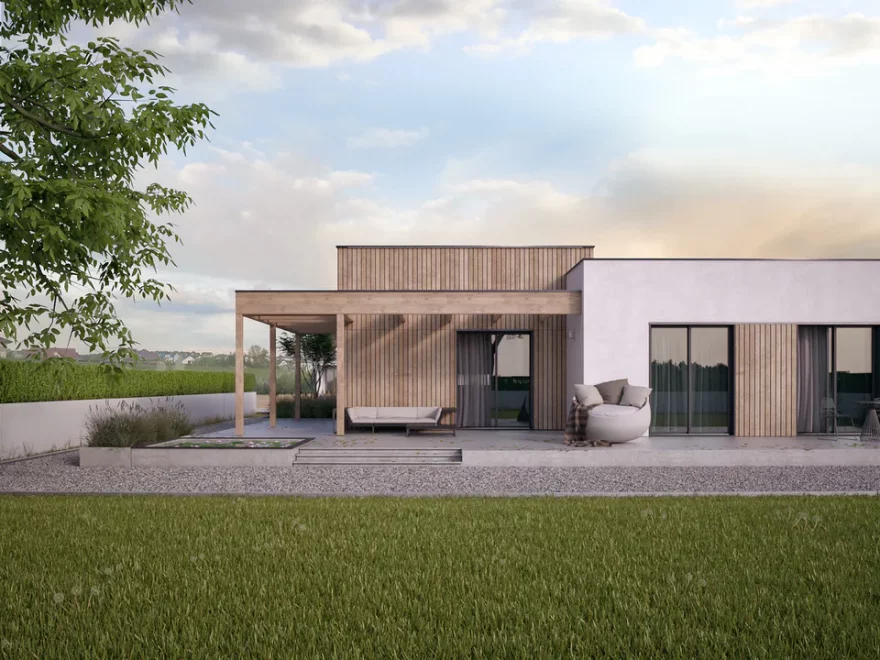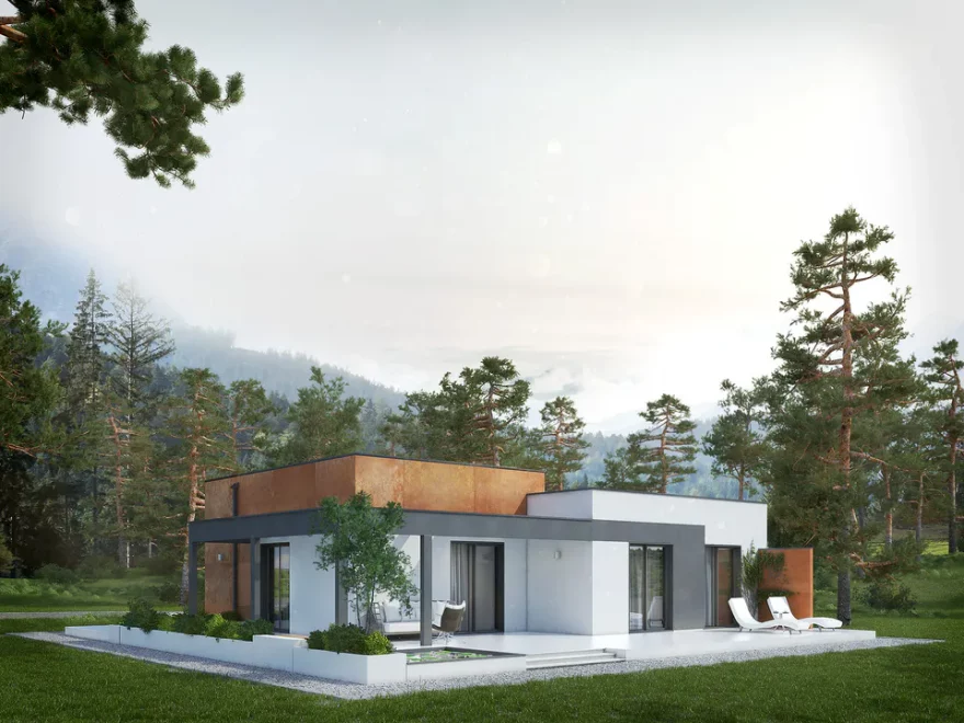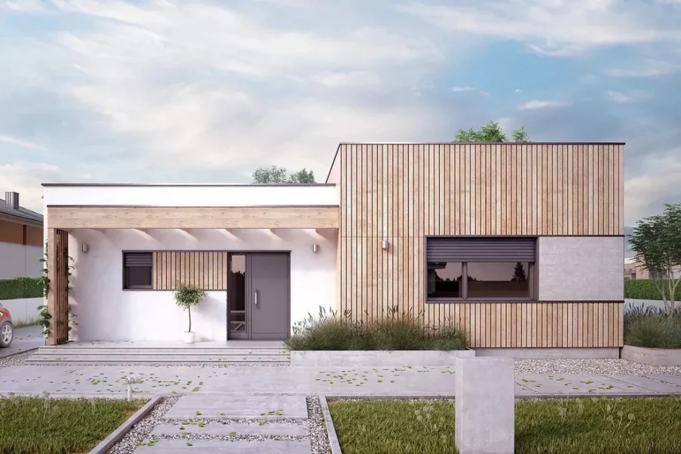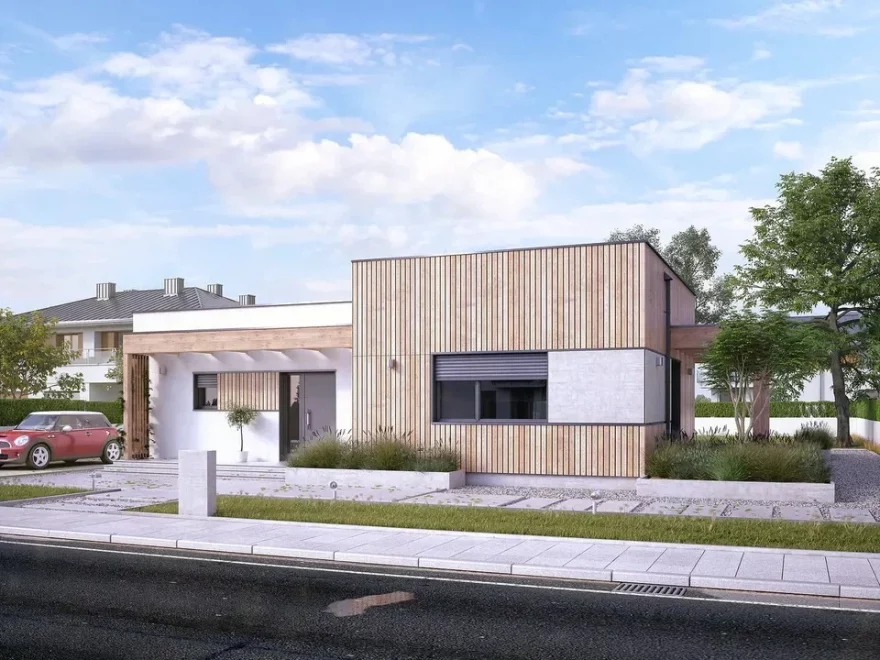 Проект AET-217 — это современный одноэтажный дом с плоской крышей, который идеально подходит для участка средней ширины. Простая и лаконичная форма здания делает строительство экономичным, а продуманная планировка обеспечивает комфортное проживание семьи из 2–4 человек.