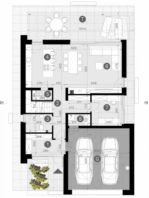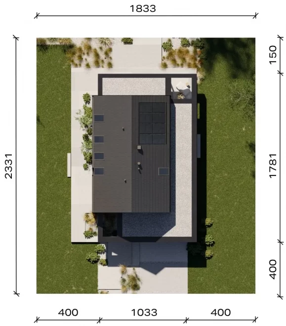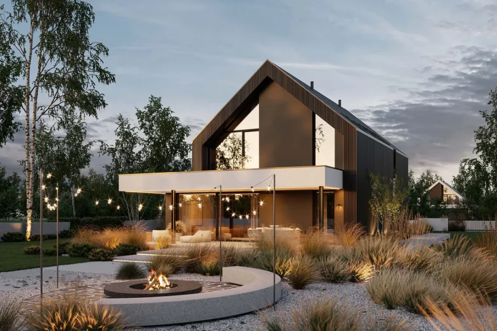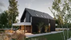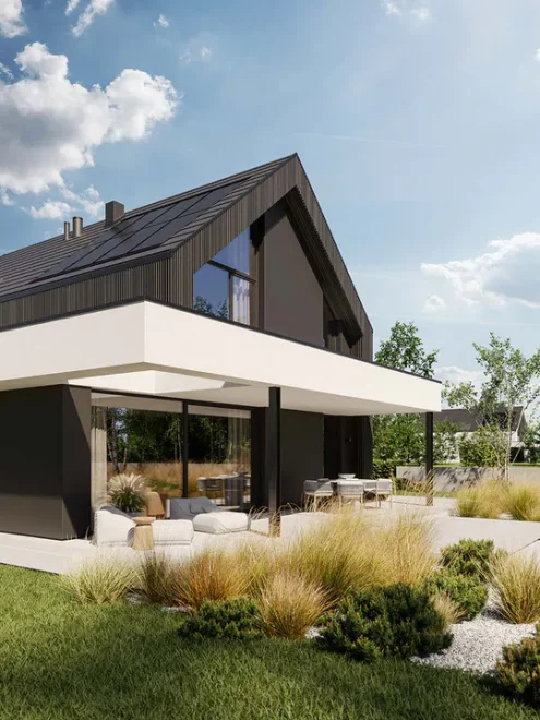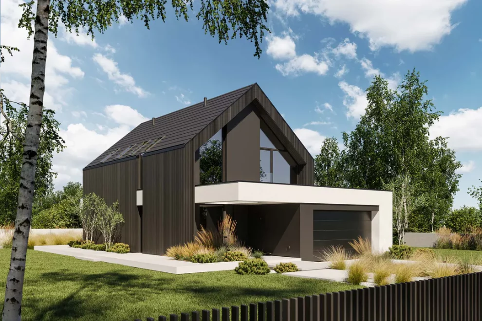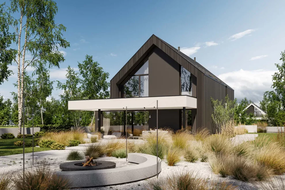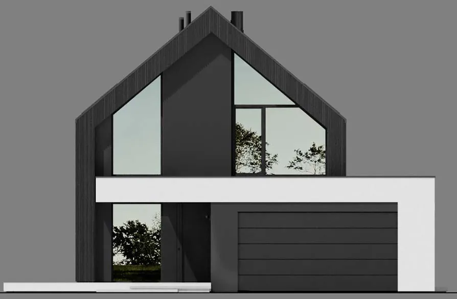 AET-222 — современный каркасный дом с мансардой, разработанный для тех, кто ценит функциональную архитектуру и эстетический стиль хай-тек. Строгие линии, продуманные акценты и динамичная форма амбара создают выразительный силуэт, а большая терраса формирует комфортное пространство для отдыха на свежем воздухе.