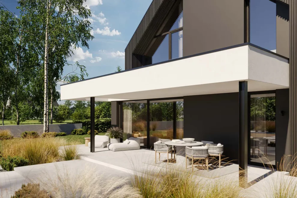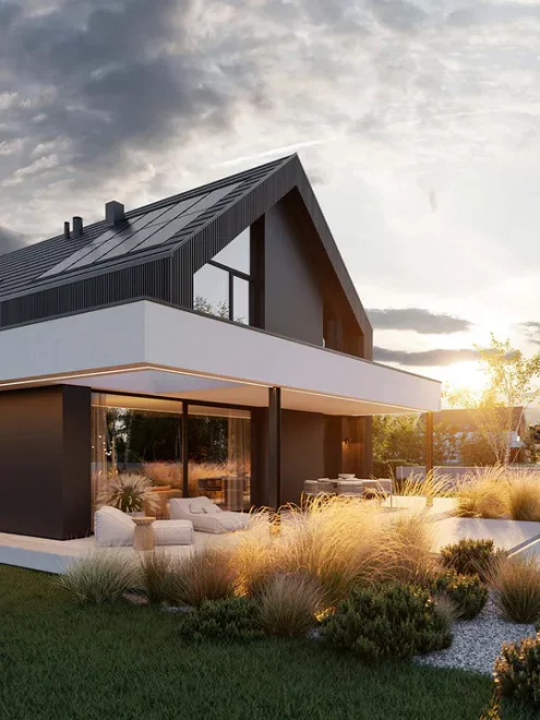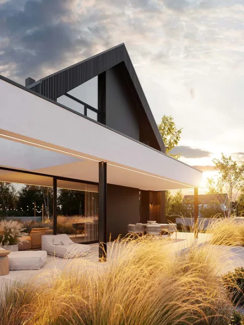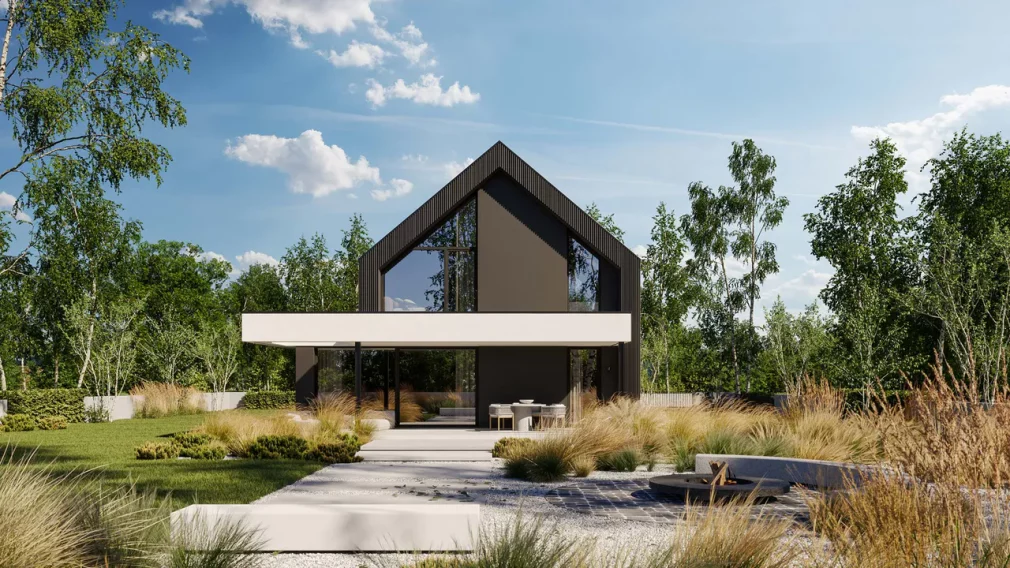 AET-222 — отличный выбор для тех, кто ищет каркасный дом хай тек под ключ, интересуется двухэтажными домами в стиле хай-тек и рассматривает современные проекты домов в стиле хай тек с мансардой.
