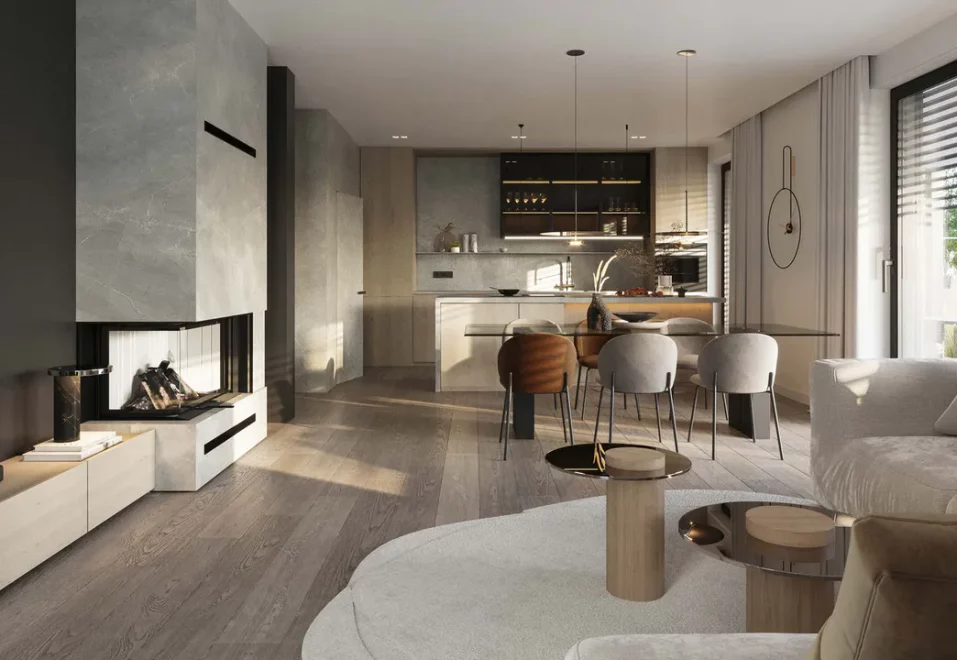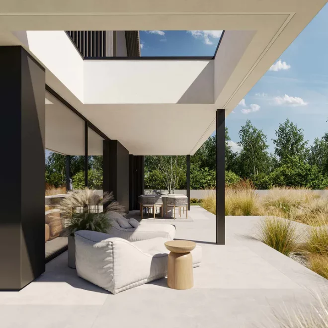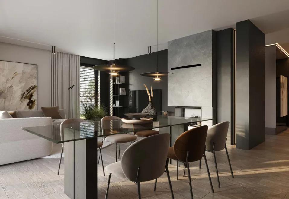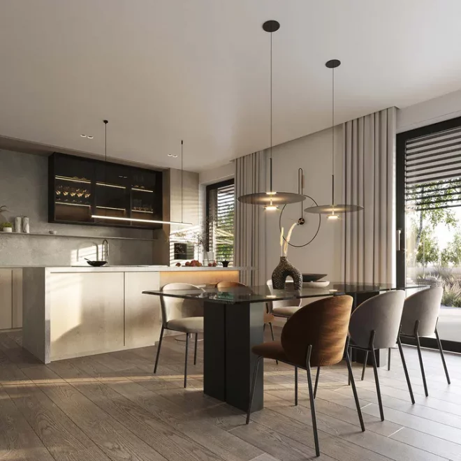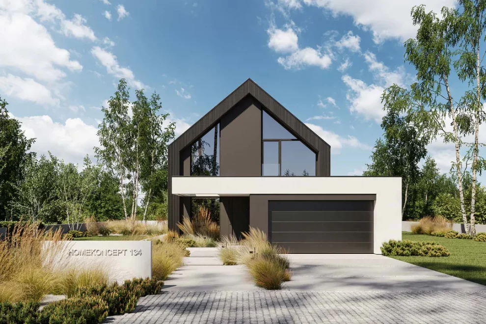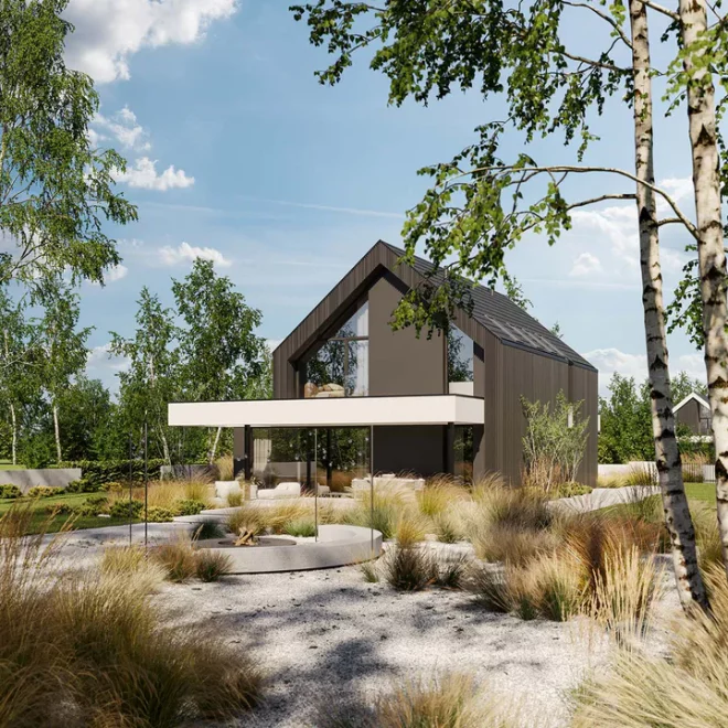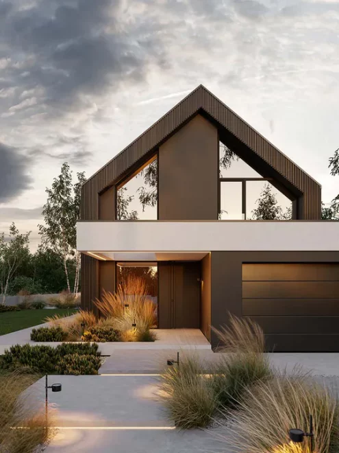Входная зона организована так, чтобы обеспечить удобство и приватность: продуманное распределение помещений, прямой доступ в гараж и функциональная ванная делают первый этаж максимально практичным. Светлая гостиная со столовой образует просторное ядро дома, плавно переходящее в кухню. Мансарда служит полноценной ночной зоной с несколькими комнатами, гардеробами и отдельной ванной. Благодаря рациональной планировке дом подходит как для семей, так и для тех, кто работает из дома.