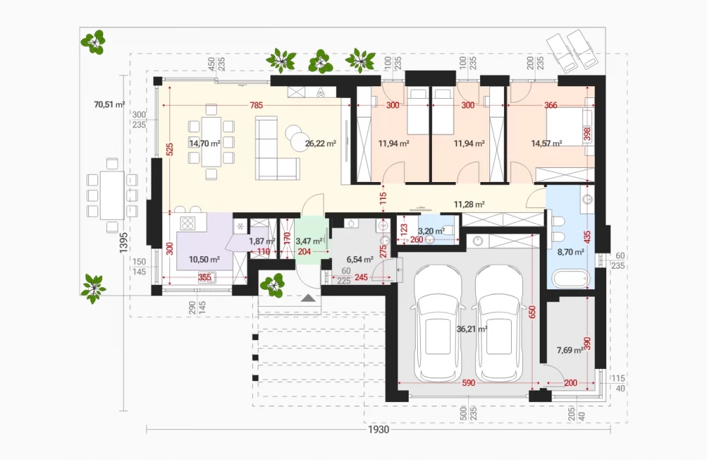 Терраса, простирающаяся вдоль частной зоны дома, превращает окружающее пространство в естественное продолжение интерьера. Спальни ориентированы таким образом, чтобы обеспечить уединение и комфорт, а функциональный набор помещений — от кладовой до просторной котельной с прачечной — делает повседневный быт максимально удобным. Встроенный гараж на два автомобиля дополняет практичность проекта, создавая полноценный комплекс для круглогодичного проживания.