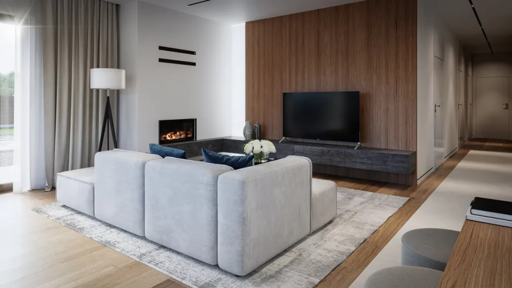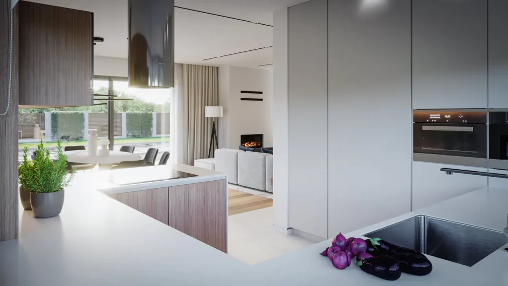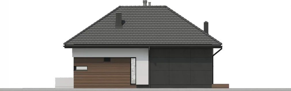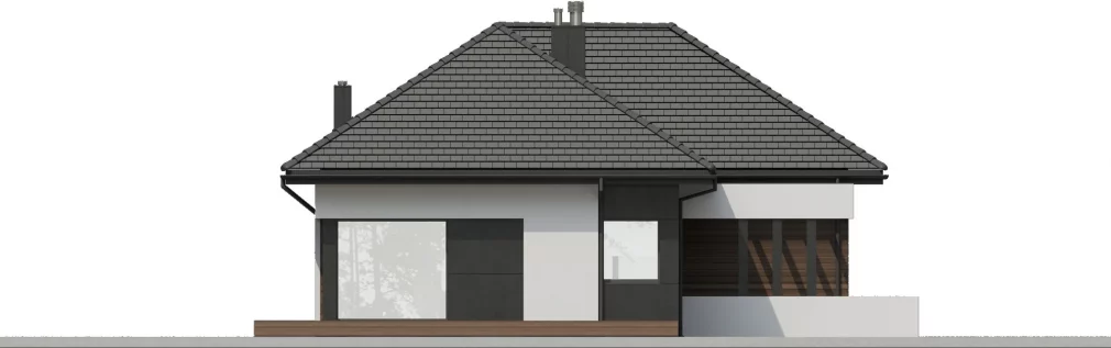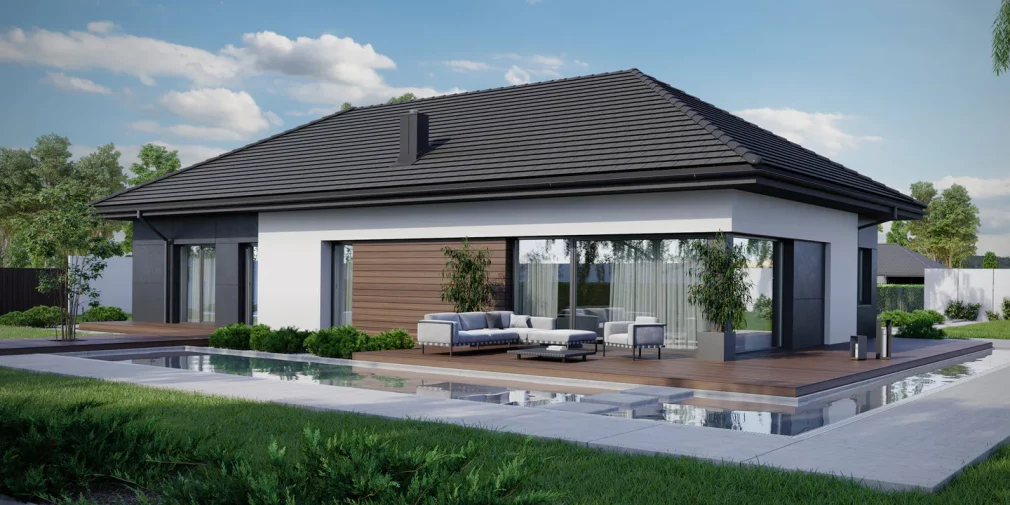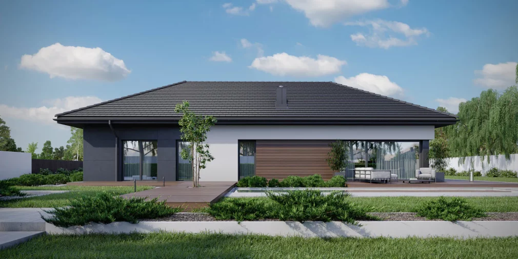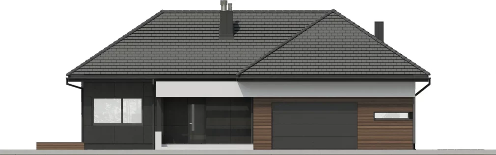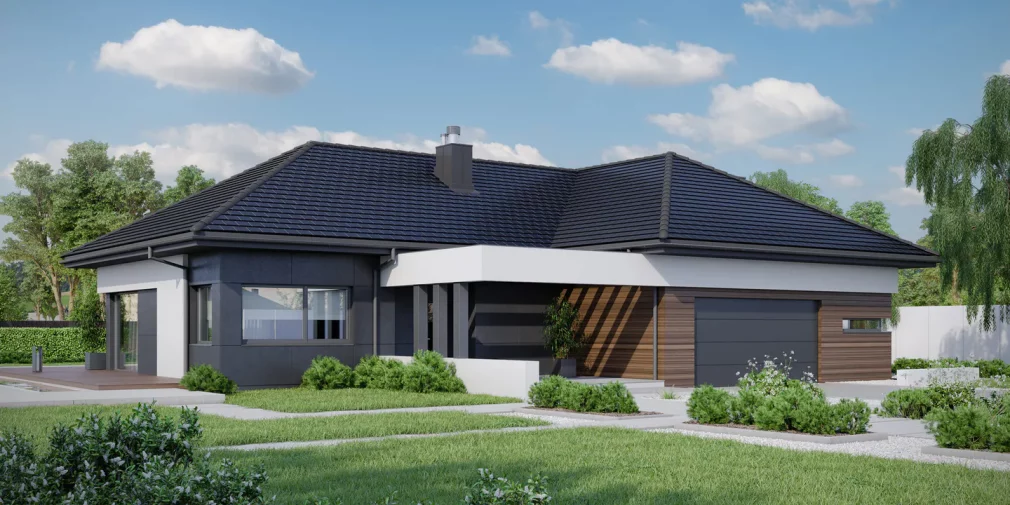 AET-224 — одноэтажный каркасный дом в стиле хай-тек, созданный для семей, которым важно сочетание комфорта, функциональности и современного архитектурного облика. Лаконичные формы, продуманная геометрия линий и грамотное сочетание материалов создают выразительный фасад, характерный для хайтек-архитектуры. Панорамное остекление заполняет дневную зону мягким естественным светом, визуально расширяя пространство гостиной, столовой и кухни, которые образуют единое, гармоничное пространство для отдыха и общения.