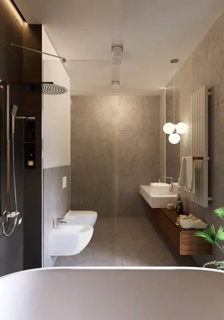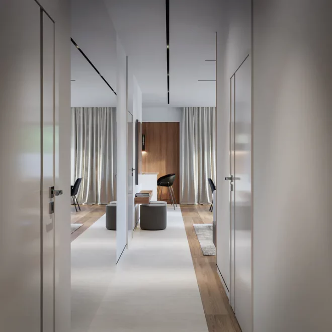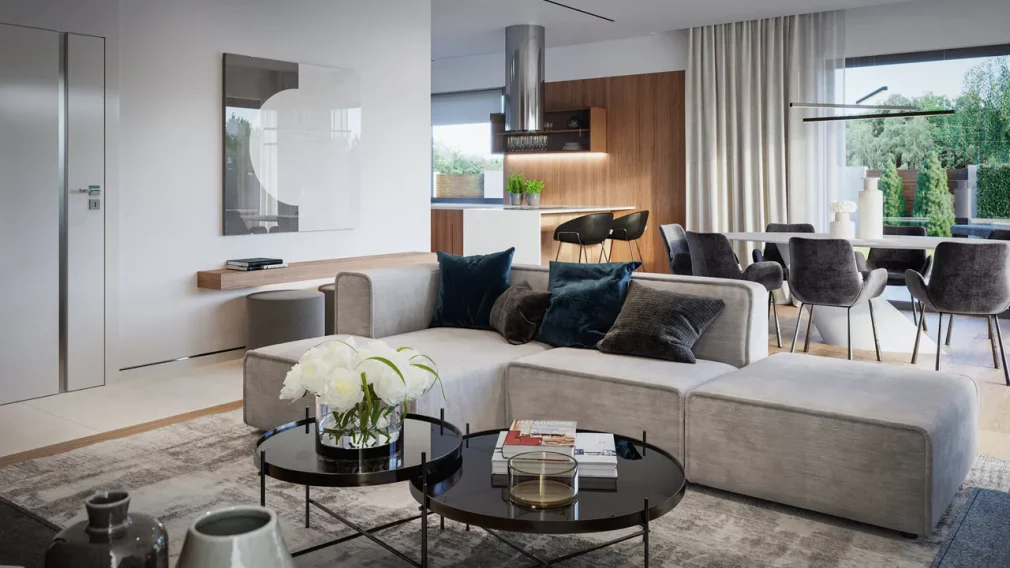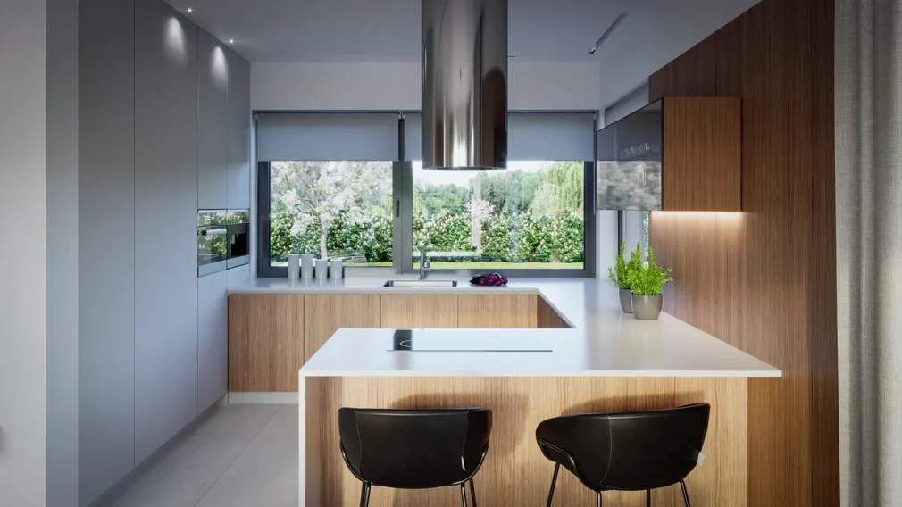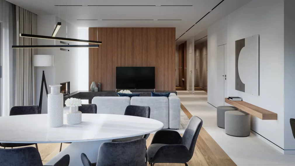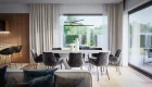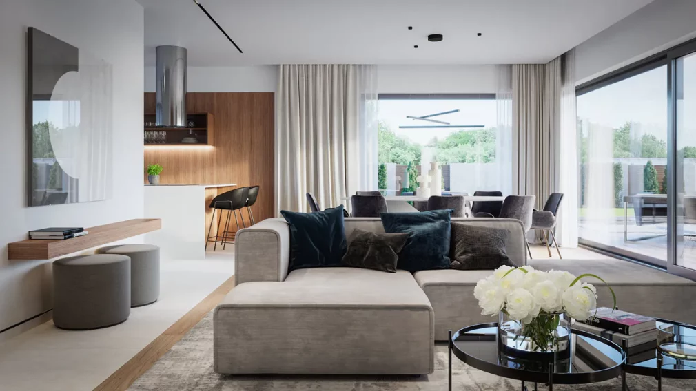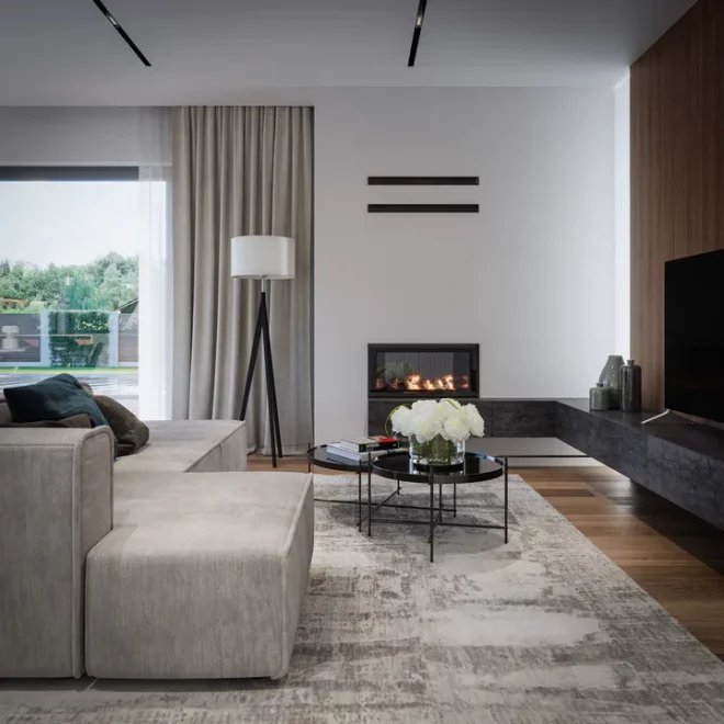 AET-224 — одноэтажный каркасный дом в стиле хай-тек, созданный для семей, которым важно сочетание комфорта, функциональности и современного архитектурного облика. Лаконичные формы, продуманная геометрия линий и грамотное сочетание материалов создают выразительный фасад, характерный для хайтек-архитектуры. Панорамное остекление заполняет дневную зону мягким естественным светом, визуально расширяя пространство гостиной, столовой и кухни, которые образуют единое, гармоничное пространство для отдыха и общения.