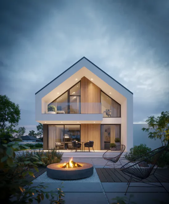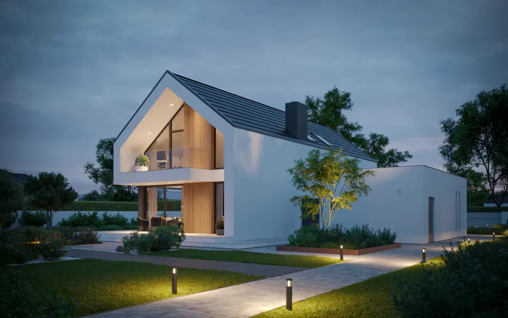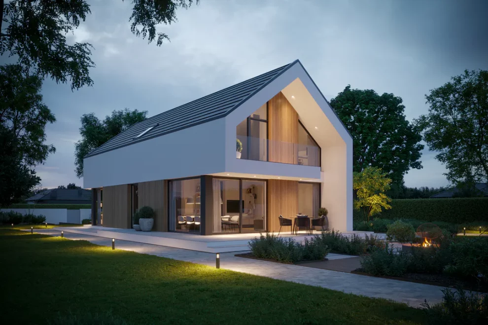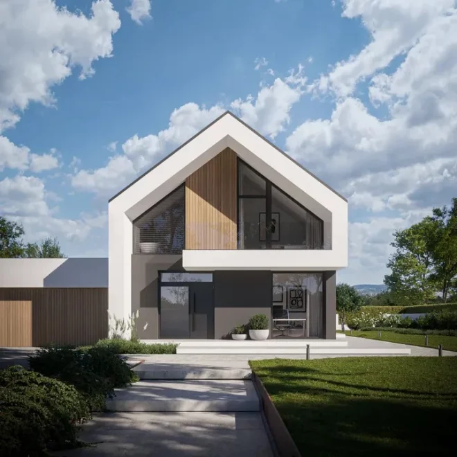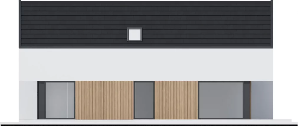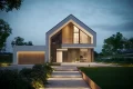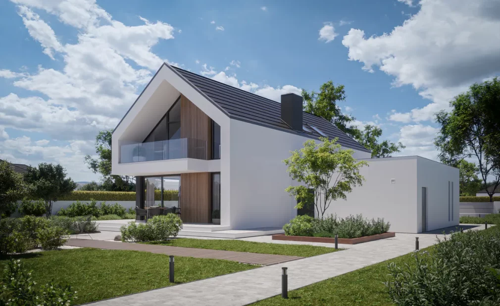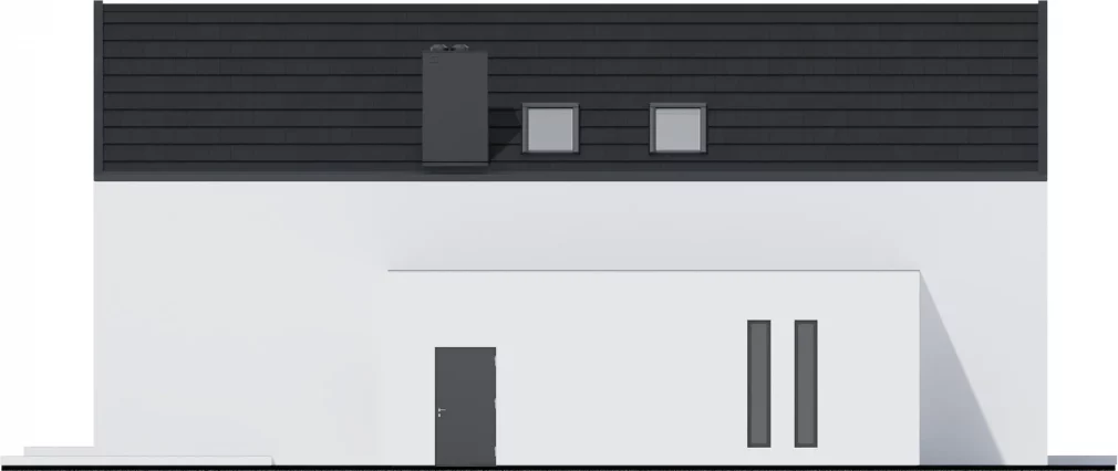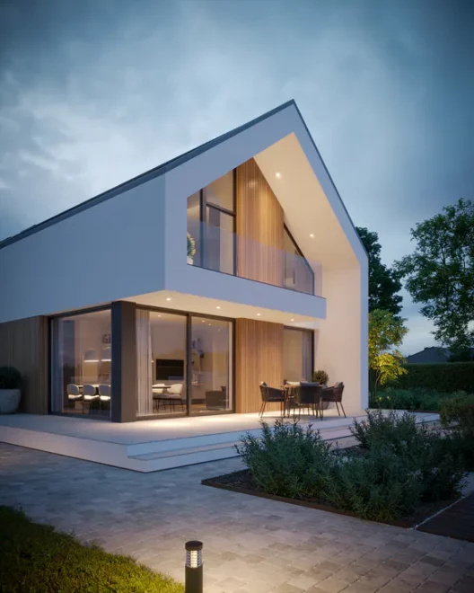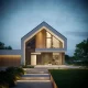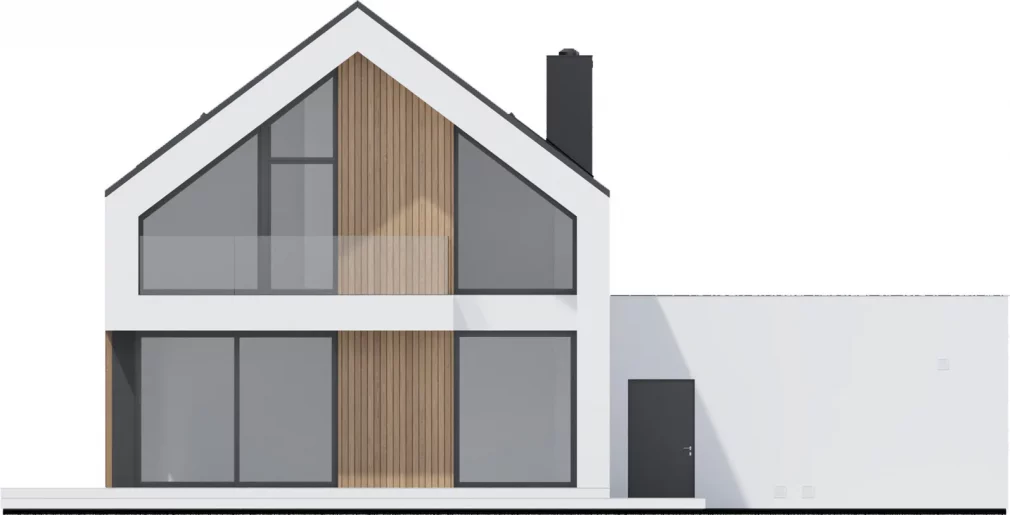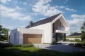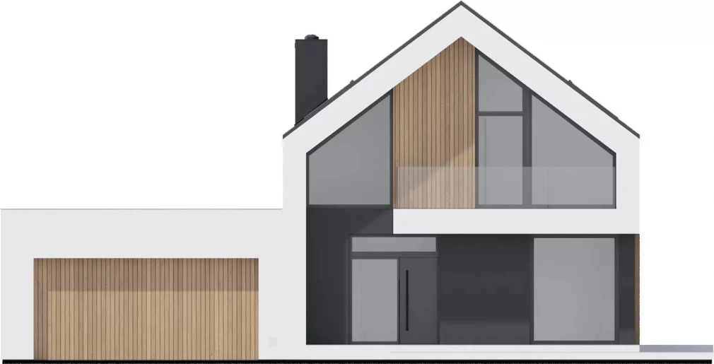 AET-226 — современный каркасный дом в стиле хай-тек с мансардой и просторной террасой, создающий гармоничное сочетание стиля и функциональности. Дневная зона объединяет гостиную, столовую и кухню с панорамным остеклением, обеспечивая максимум естественного света и визуальное единство с окружающим садом.