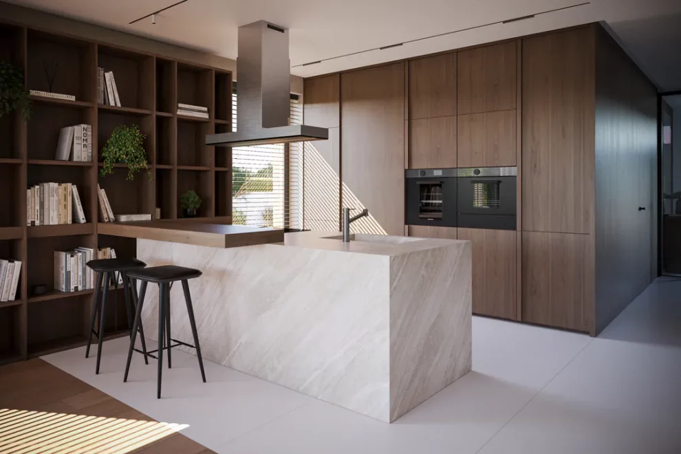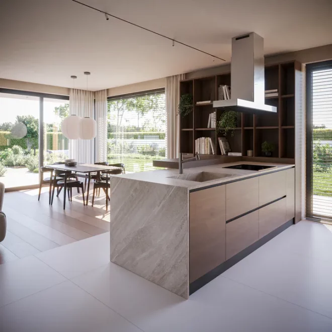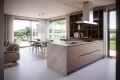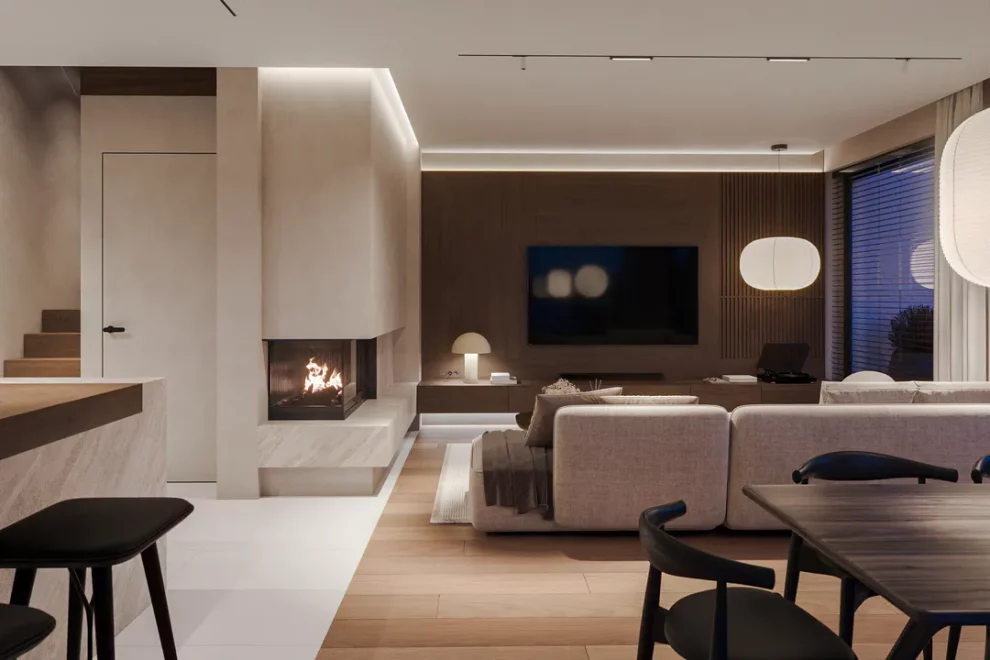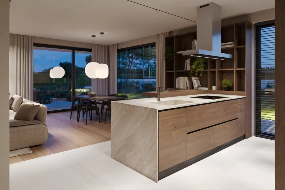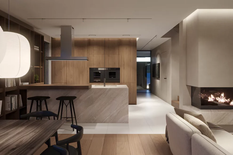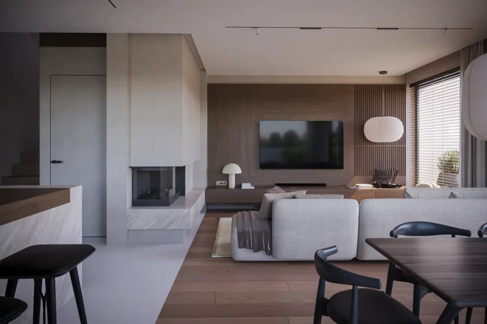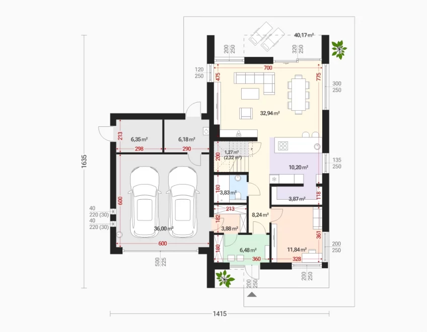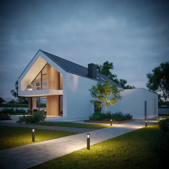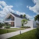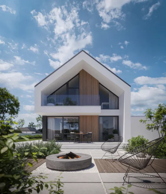 AET-226 — современный каркасный дом в стиле хай-тек с мансардой и просторной террасой, создающий гармоничное сочетание стиля и функциональности. Дневная зона объединяет гостиную, столовую и кухню с панорамным остеклением, обеспечивая максимум естественного света и визуальное единство с окружающим садом.