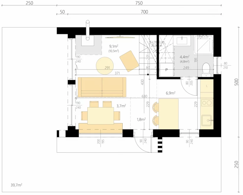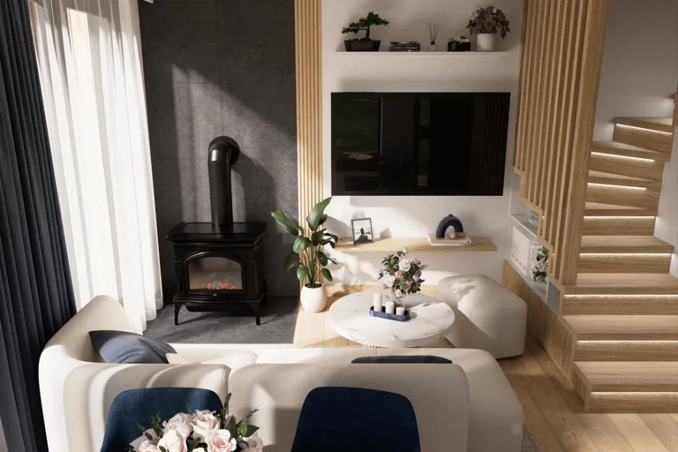 Функциональное пространство дома продумано для максимального удобства. Первый этаж представляет собой светлую открытую дневную зону: здесь расположены уютная Гостиная с возможностью установки камина, Кухня и выделенная Обеденная часть. Неожиданно просторная Ванная комната на первом уровне обеспечивает высокий комфорт ежедневного использования. Мансарда — приватный ярус, который включает две независимые Комнаты-спальни и отдельный Туалет. Благодаря такой планировке, дом идеально подходит для семьи из четырех человек, становясь отличным выбором для дачного участка или в качестве полноценного жилья в живописном месте.