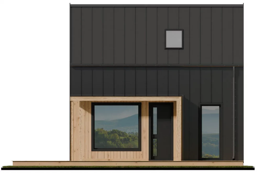 Архитектурный стиль AET-232 отличается легкостью и современным характером. Фасад гармонично сочетает натуральную вертикальную доску и фальцевую металлическую отделку. В комбинации с большими остеклениями, эти элементы придают дому выразительный и чистый силуэт. Проект доказывает, что каркасный дом в стиле барнхаус может быть экономичным, не жертвуя при этом эстетикой и комфортом.