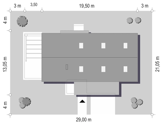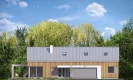 Уникальной архитектурной особенностью является эффектная входная группа и выступающий гаражный блок на два автомобиля, который расположен в центральной части здания. Такое расположение гаража упрощает логистику, обеспечивая удобное сообщение с Холлом, Котельной и Кухней, что редко встречается в домах такой формы.