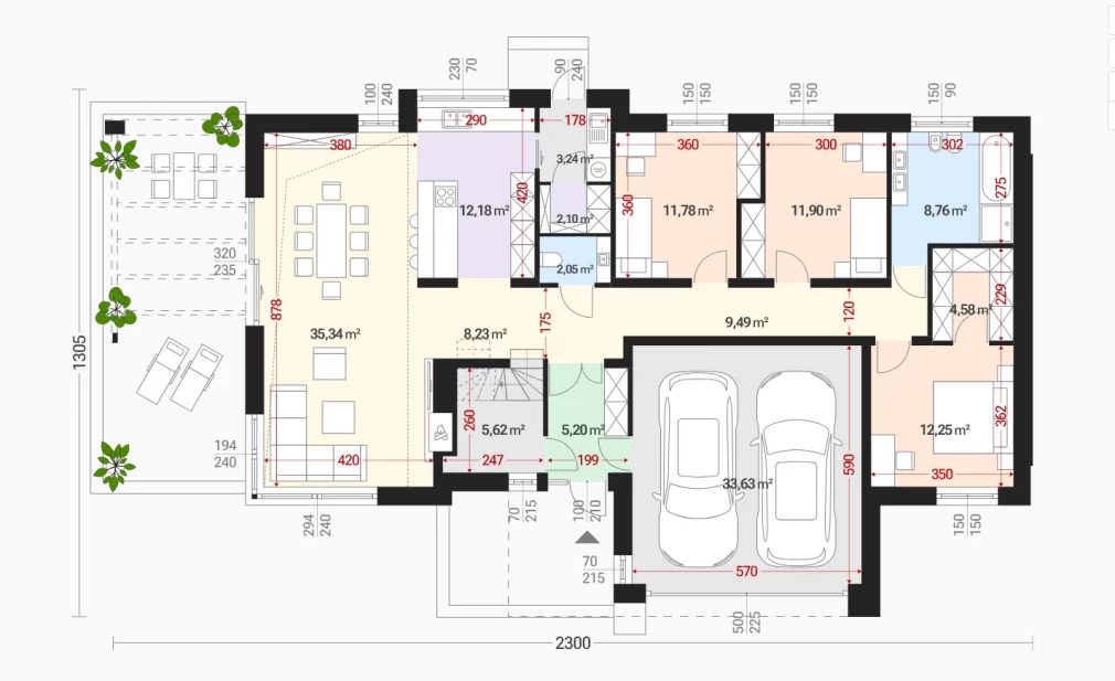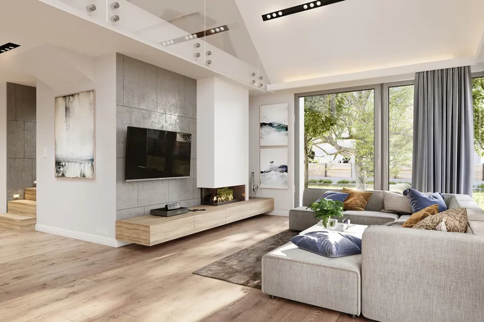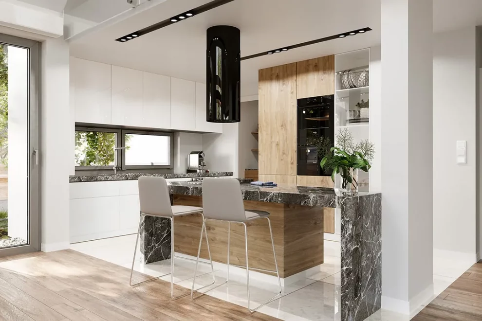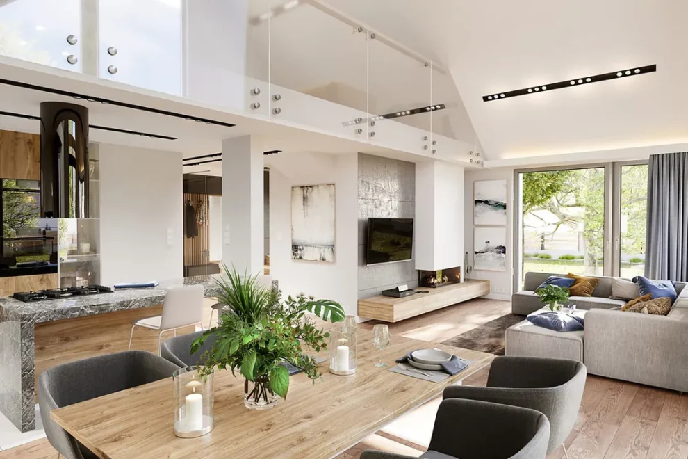 Интерьер AET-235 продуман до мелочей. Обширная дневная зона объединяет светлую Гостиную, Столовую и Кухню, отделенную полуостровом с барной стойкой. Гостиная освещена сразу с трех сторон и имеет эффектную двухсветную зону, простирающуюся до самой крыши, над которой расположена Антресоль на мансарде. Эта Антресоль, наряду с вместительным Чердаком, может быть использована как дополнительная жилая зона или место для хранения, в зависимости от потребностей владельцев. Приватная часть дома включает три комфортабельные Спальни, большую Ванную комнату и Гардеробную. Дом 235 — это удобная, современная и энергоэффективная вилла для большой семьи, демонстрирующая, что каркасные дома под ключ барнхаус могут сочетать сложный дизайн с простотой строительства, а также идеальную адаптацию к участкам с въездом с южной стороны благодаря боковому расположению террасы. Это высокофункциональный барнхаус каркасные дома для семьи из 4–6 человек.