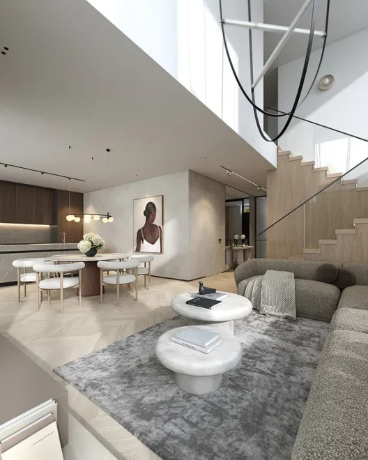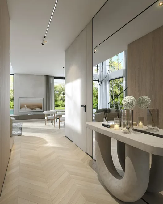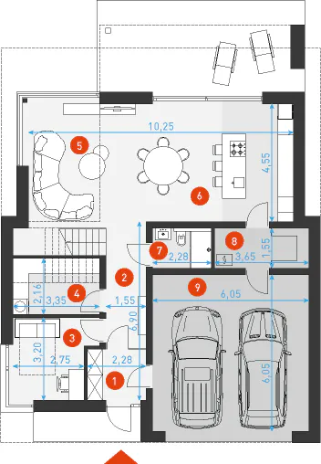 Первый этаж спроектирован как зона активного отдыха и семейного общения. Просторная гостиная отделена от зоны кухни и столовой, что позволяет создать уютную атмосферу в каждой части дома. Большие площади остекления визуально объединяют интерьер с ландшафтом участка, что особенно ценится в сегменте проекты современных домов с панорамным остеклением. На этом же уровне расположена гостевая комната и необходимые технические помещения, включая гардеробную-прачечную и удобный переход в гараж через хозяйственный блок.