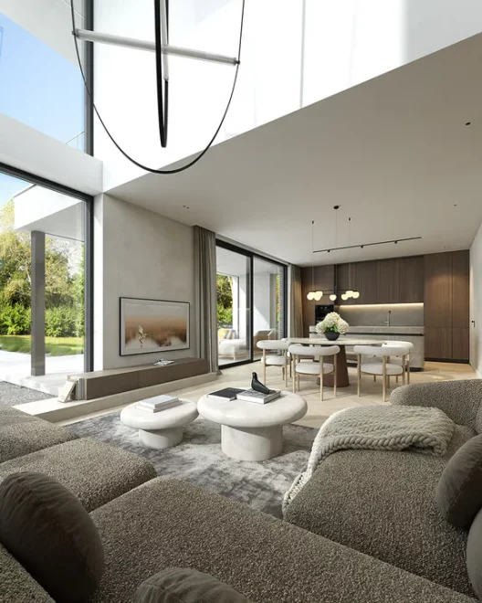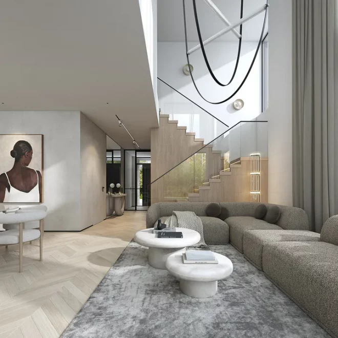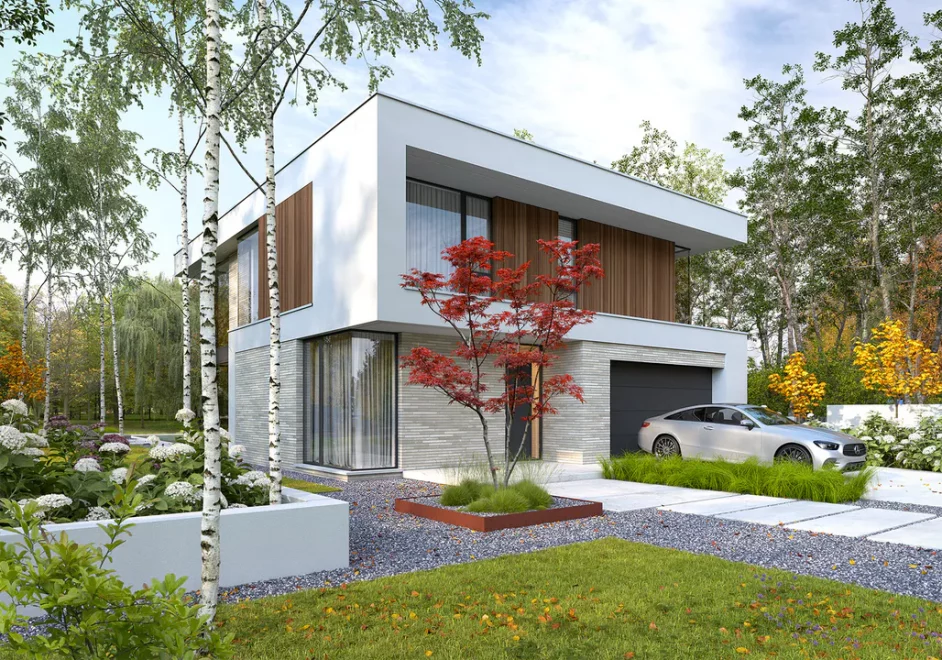 Проект AET-240 — это просторный двухэтажный дом, который станет идеальным решением для большой семьи, стремящейся к высокому уровню комфорта и современной эстетике. Архитектура здания отличается четкими линиями и монументальностью, а наличие встроенного двухместного гаража делает его максимально практичным для автовладельцев. Этот каркасный современный дом с панорамными окнами гармонично сочетает в себе приватность и открытость, создавая защищенное, но при этом светлое пространство для жизни.
