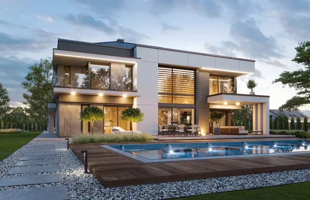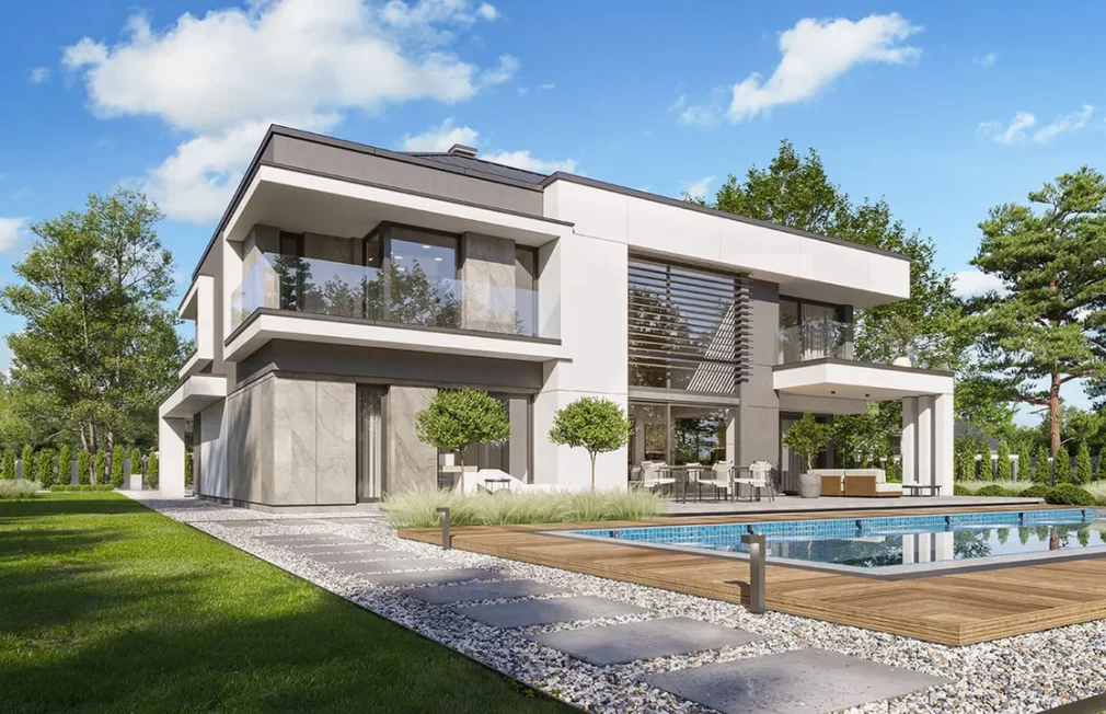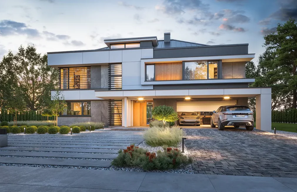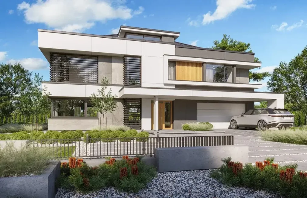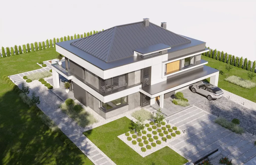 Проект AET-242 — это роскошный двухэтажный особняк, который воплощает в себе современные стандарты премиального жилья. Масштабная архитектура здания дополнена интегрированным двухместным гаражом, что обеспечивает максимальный комфорт для владельцев нескольких автомобилей. Этот двухэтажный дом с панорамными окнами спроектирован для тех, кто не привык к компромиссам в вопросах пространства и функциональности, предлагая впечатляющую площадь для жизни и отдыха большой семьи.