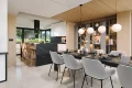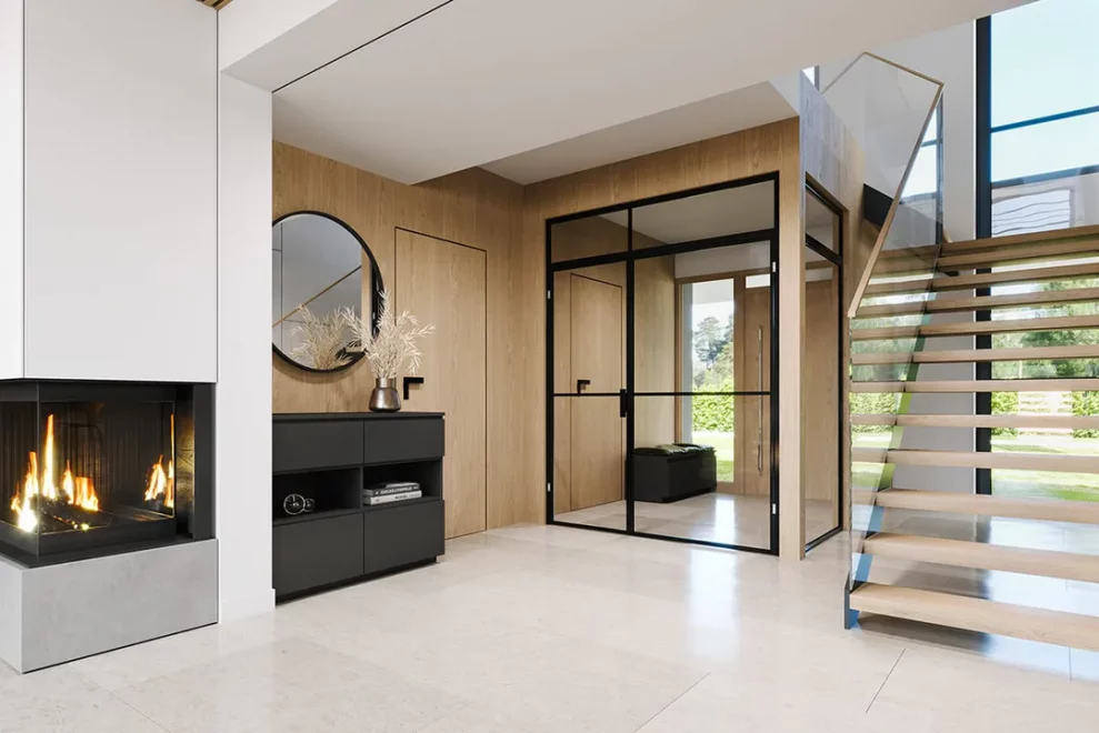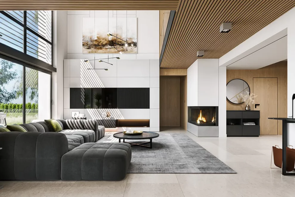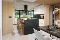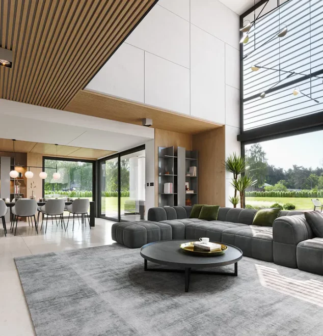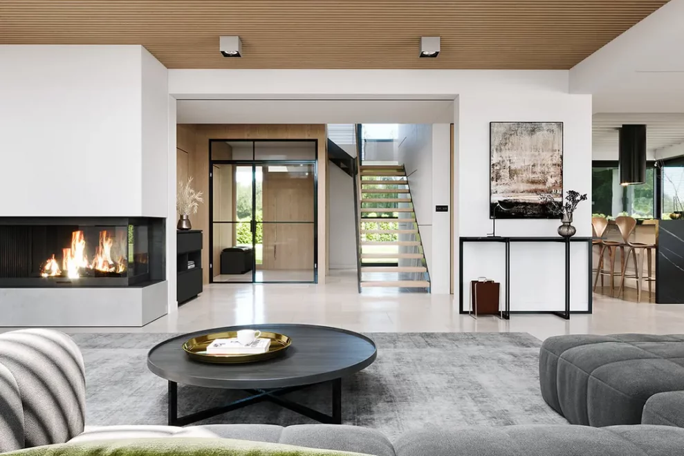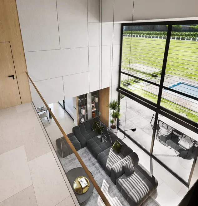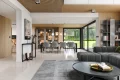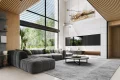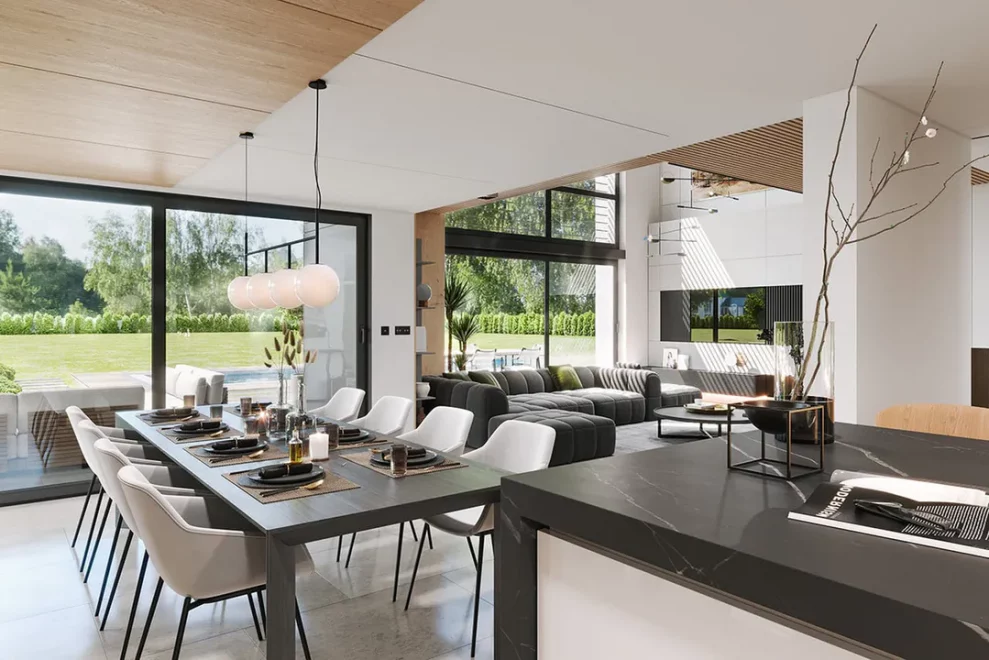 Первый этаж поражает своим размахом: здесь расположена грандиозная дневная зона, объединяющая гостиную и столовую в единое пространство для приемов и торжеств. Кухня, дополненная практичной кладовой, позволяет реализовать любые кулинарные сценарии, не нарушая эстетику интерьера. Благодаря тому, что это каркасный современный дом с панорамными окнами, границы между внутренним убранством и садом практически исчезают, наполняя комнаты светом и воздухом. На этом же уровне предусмотрен отдельный рабочий кабинет или гостевая комната, а также полноценный технический блок с котельной.