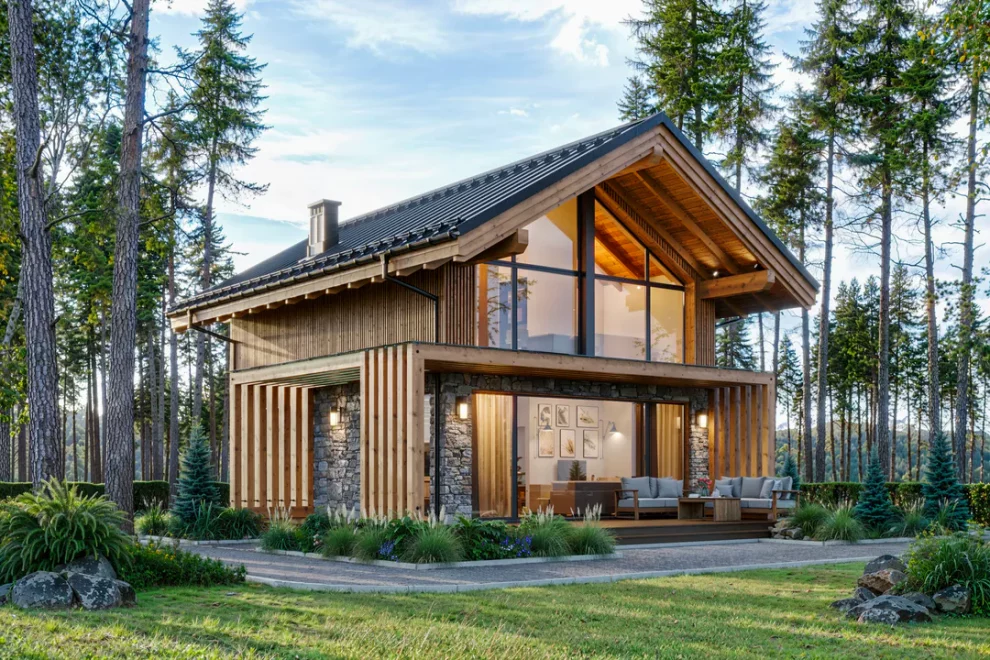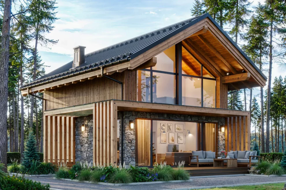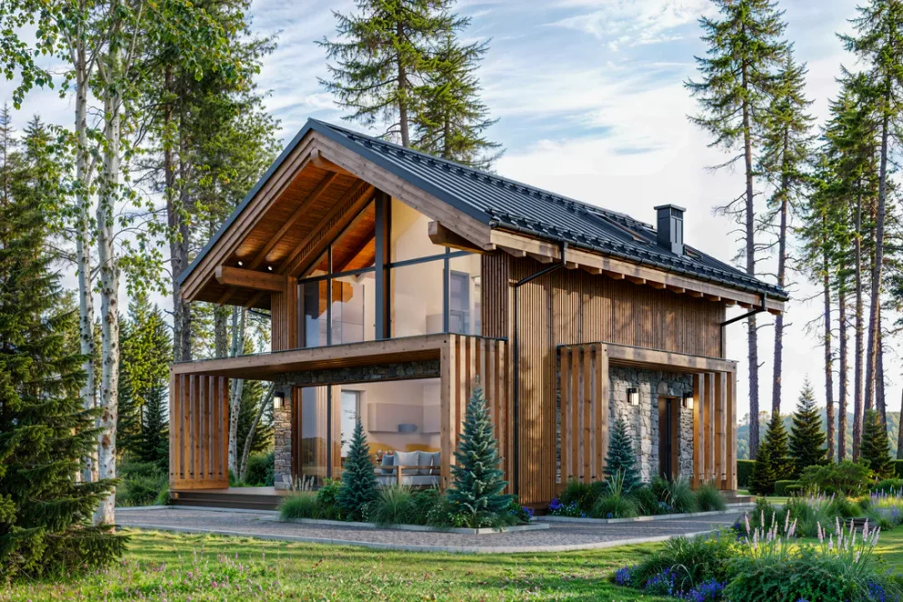 Проект AET-243 — это выразительное прочтение стиля «современная стодола», где традиционные альпийские мотивы встречаются с передовыми технологиями домостроения. Благодаря классической прямоугольной форме и двускатной крыше с глубокими свесами, этот каркасный современный дом с панорамными окнами выглядит надежно и монументально. Особенностью архитектуры является высокая коленная стена, которая позволяет максимально эффективно использовать пространство мансардного этажа, избавляя комнаты от резких скосов и создавая ощущение полноценного двухэтажного жилья.