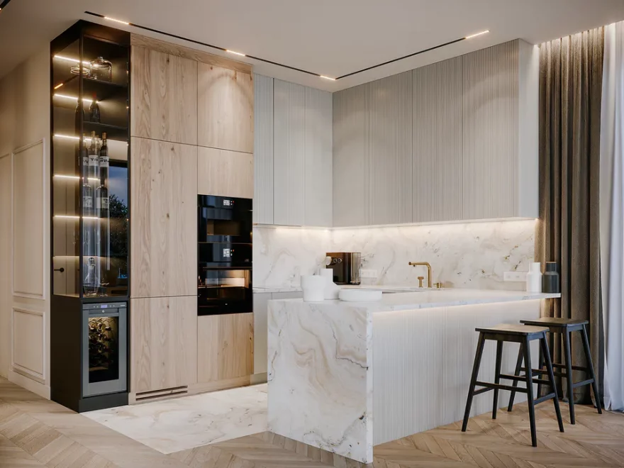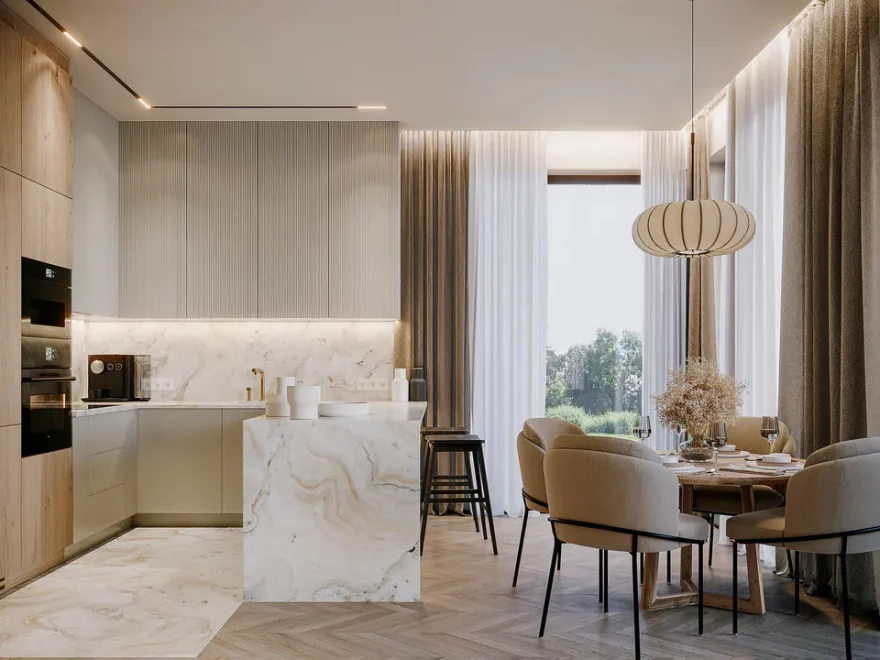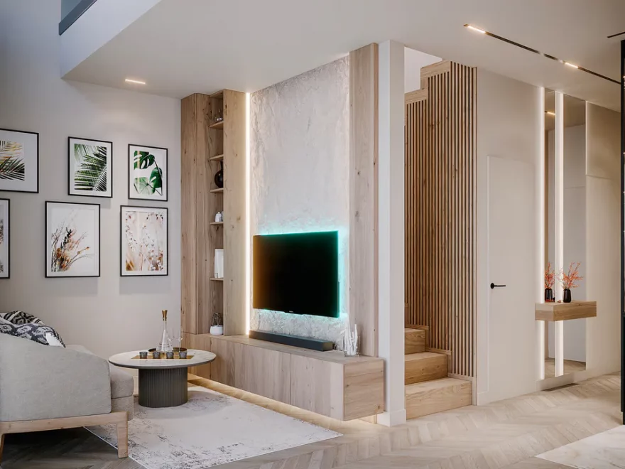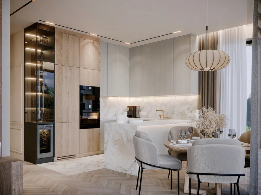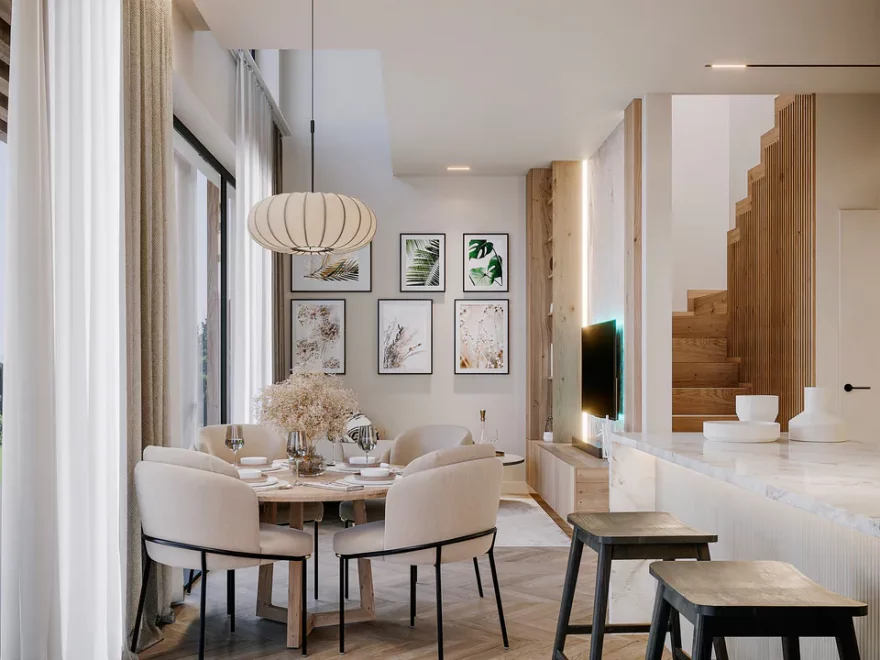 Внутренняя планировка ориентирована на свет и открытость. Первый этаж занимает объединенная дневная зона с гостиной, кухней и столовой, где главным украшением служит антресоль и полностью остекленная стена, выходящая в сад. Такое решение превращает проект дома с панорамными окнами в личную обсерваторию, наполненную воздухом и природными красками. Помимо общего пространства, на нижнем уровне предусмотрена компактная спальня и несколько технических помещений, обеспечивающих удобство хранения и эксплуатации инженерных систем.