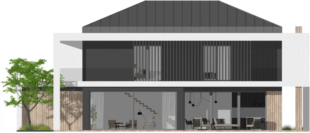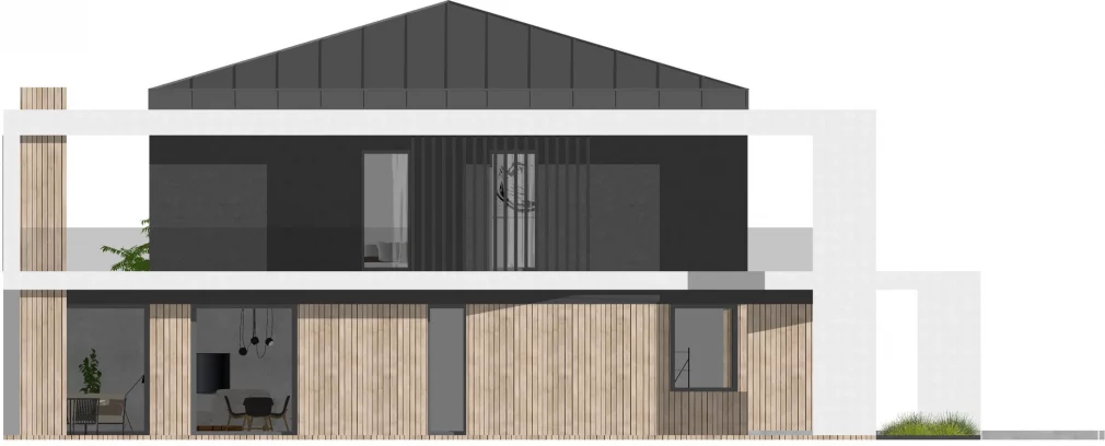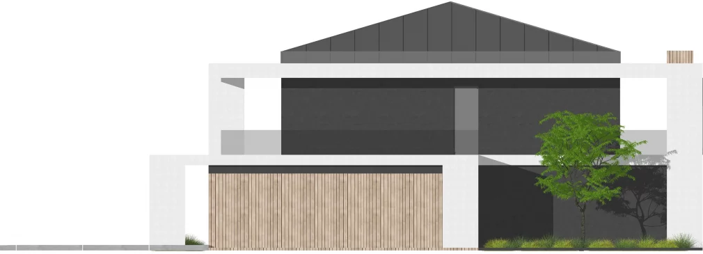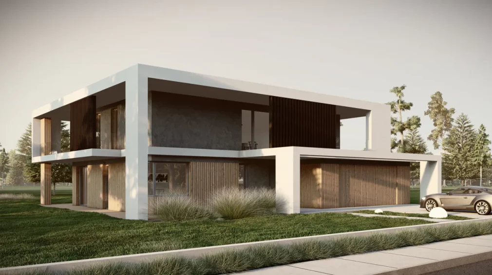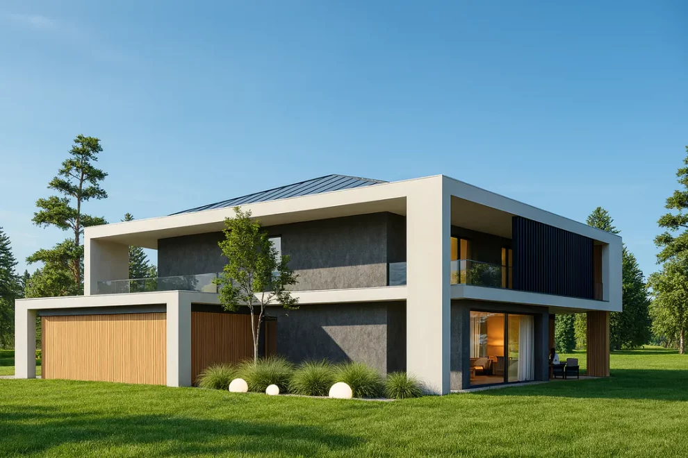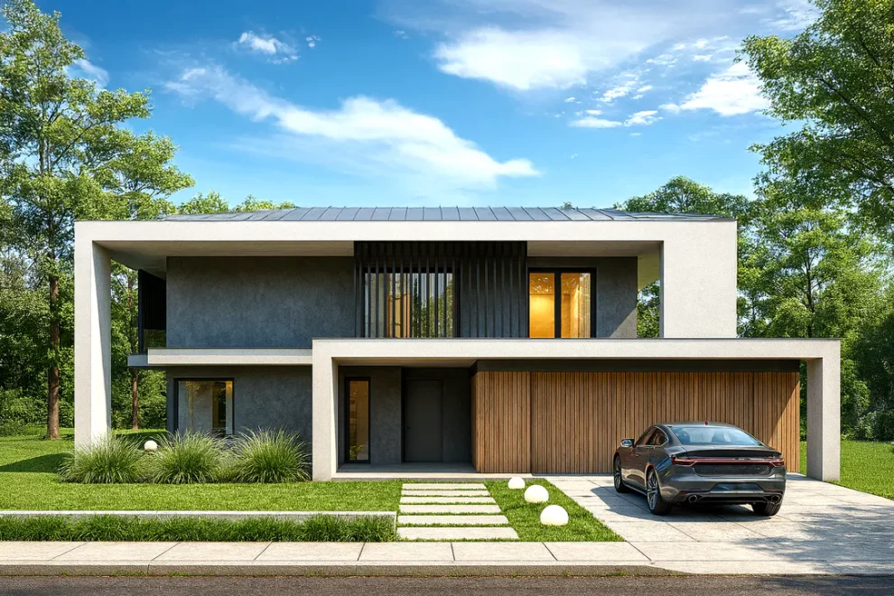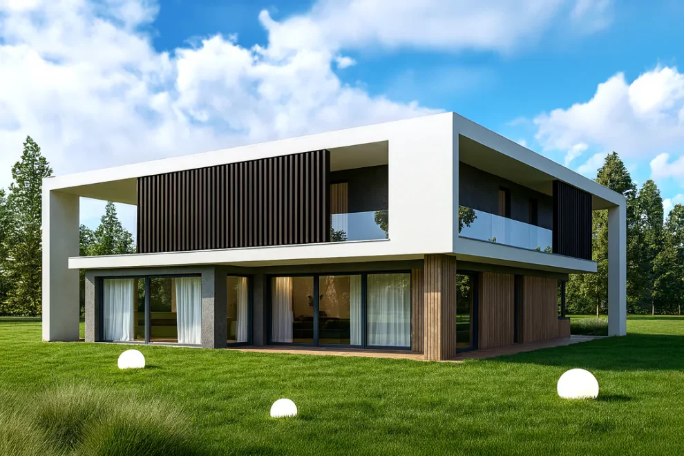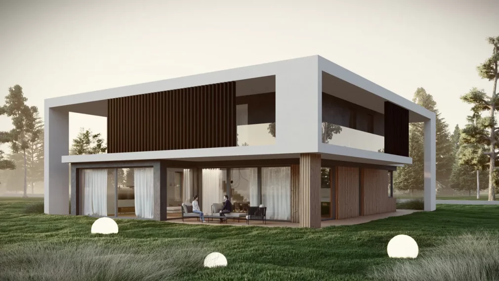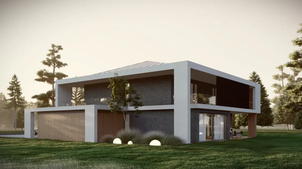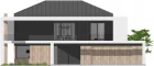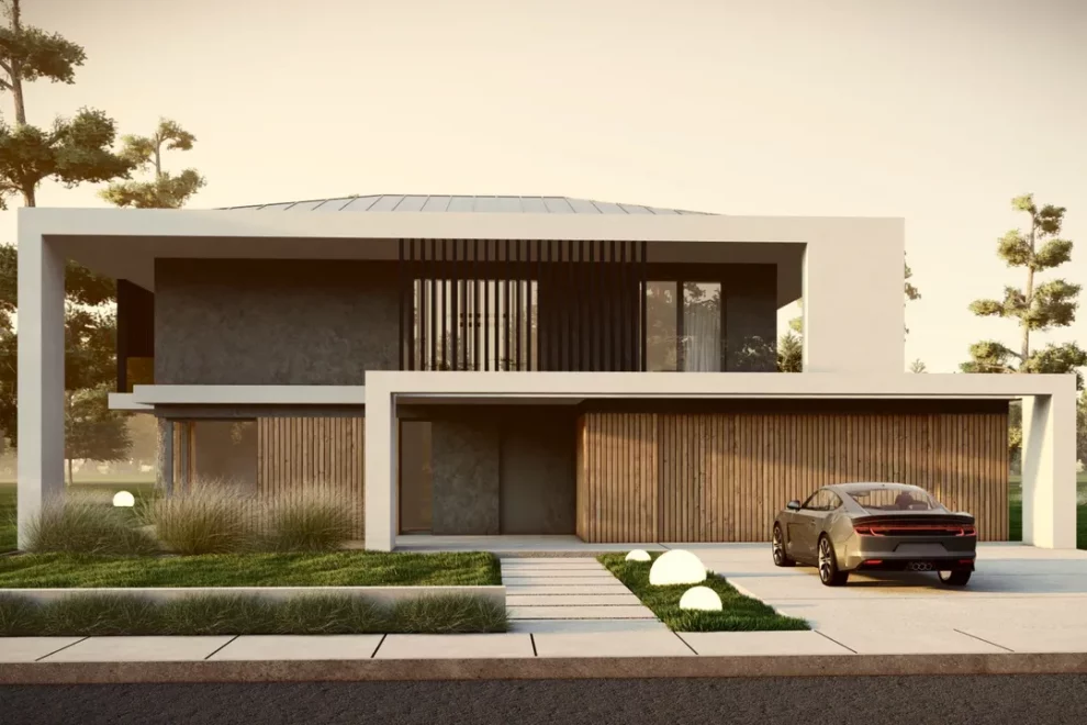 Проект AET-244 — это образец современной архитектуры, в котором монументальность форм сочетается с визуальной легкостью. Здание выполнено в контрастной цветовой гамме с использованием белой и графитовой отделки, дополненной вертикальными деревянными панелями. Этот каркасный современный дом с панорамными окнами выглядит изящно и актуально, несмотря на свои внушительные габариты. Лаконичный дизайн и продуманное остекление со стороны сада позволяют дому гармонично вписаться в загородный ландшафт, наполняя внутренние помещения светом.