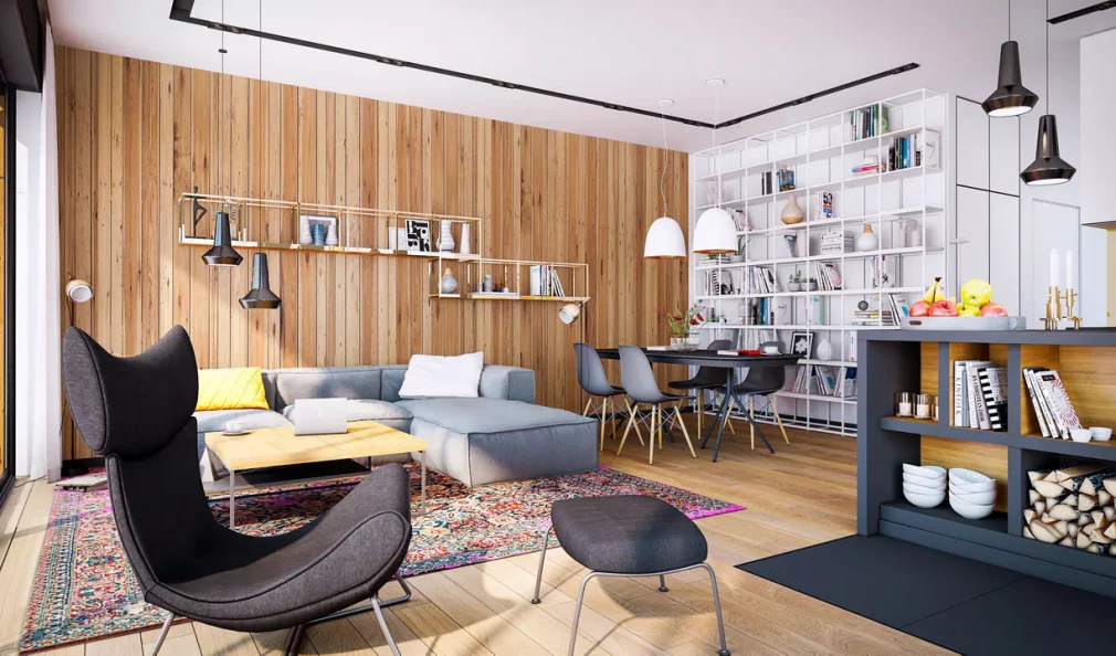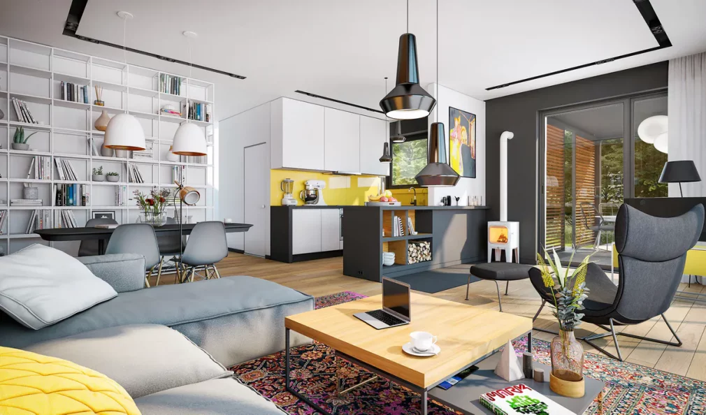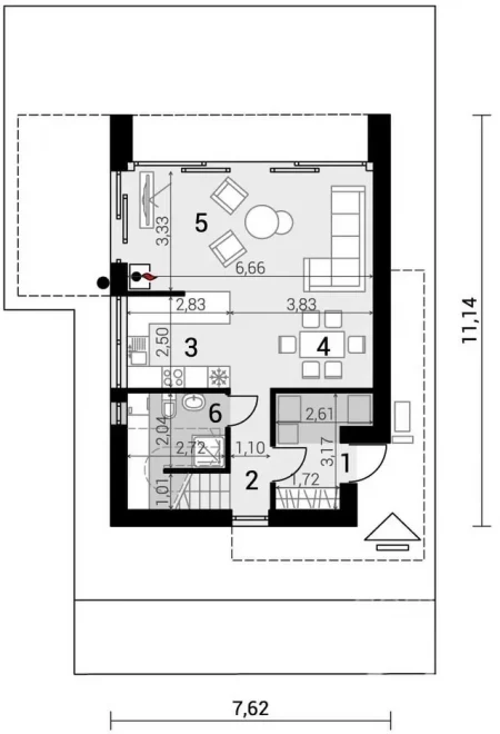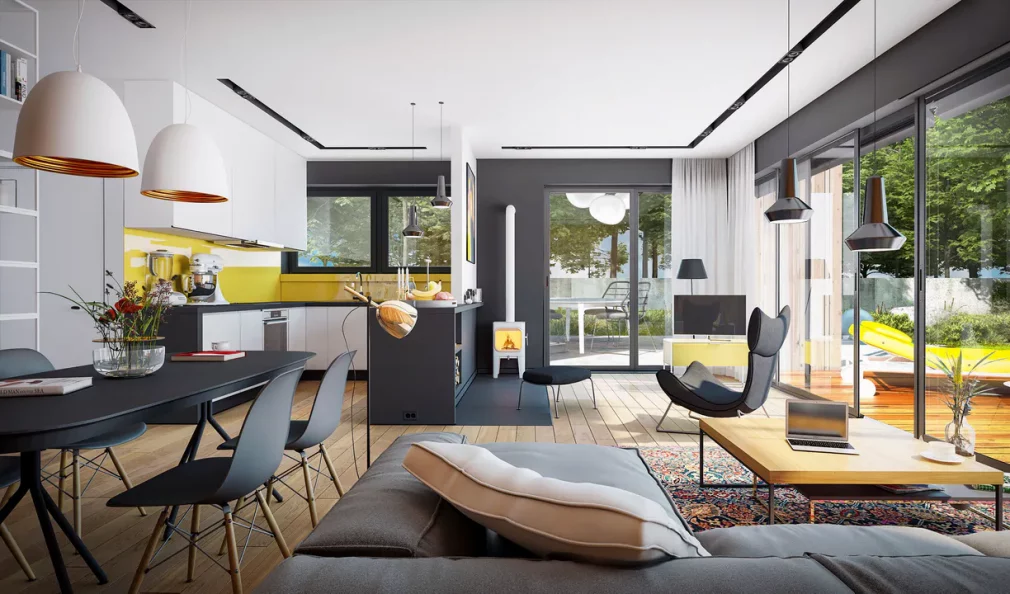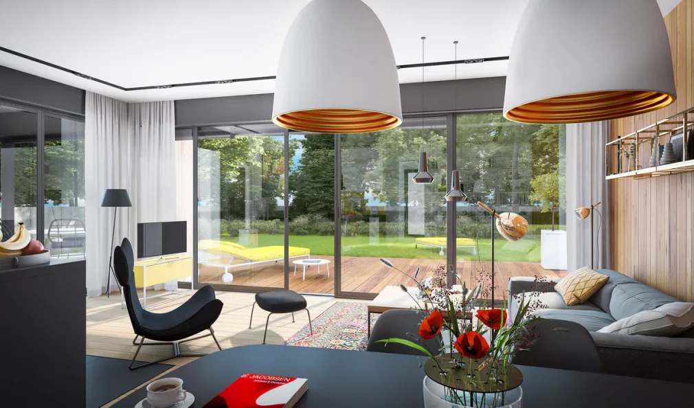 Внутренняя планировка дома отличается безупречной логикой и четким зонированием. Весь первый этаж отведен под дневную активность: здесь расположилась светлая кухня, переходящая в уютную столовую, и просторная гостиная. Благодаря архитектурному решению использовать проекты современных домов с панорамным остеклением, интерьер первого этажа буквально пронизан светом, а граница между домом и садом становится почти неощутимой. Из гостиной предусмотрен выход на широкую террасу, которая служит естественным продолжением жилого пространства и идеальным местом для семейных ужинов на свежем воздухе.