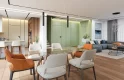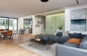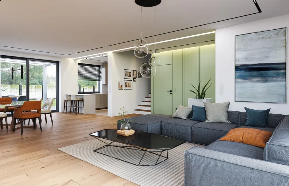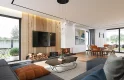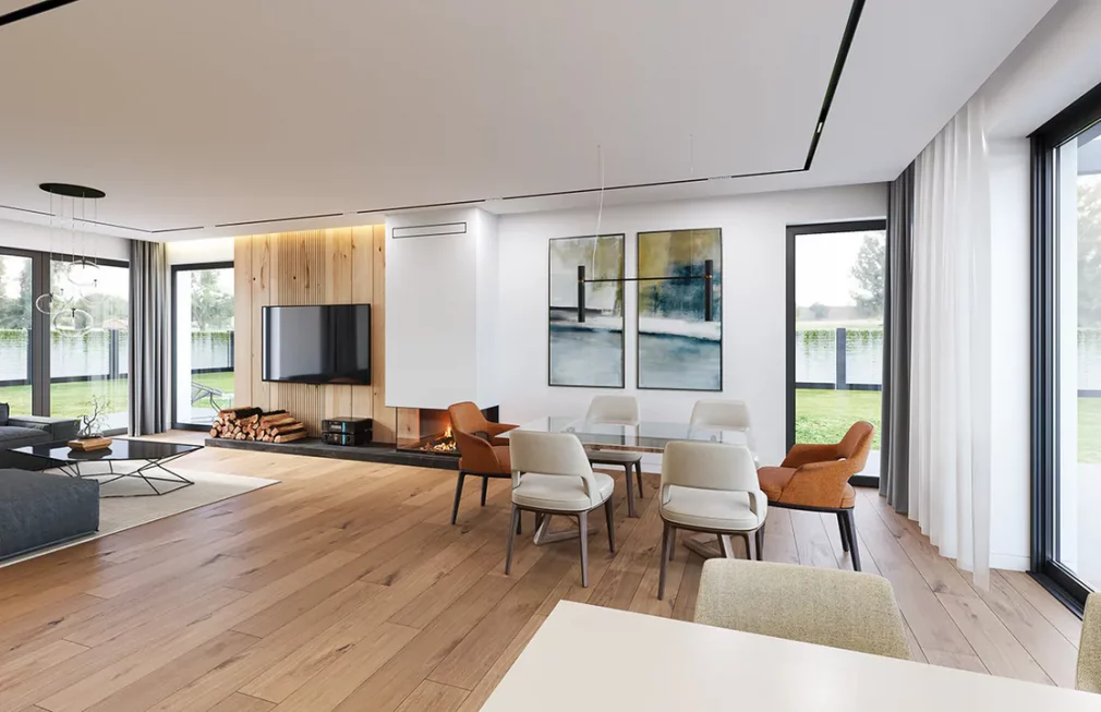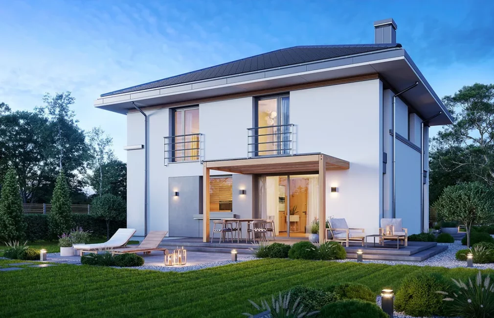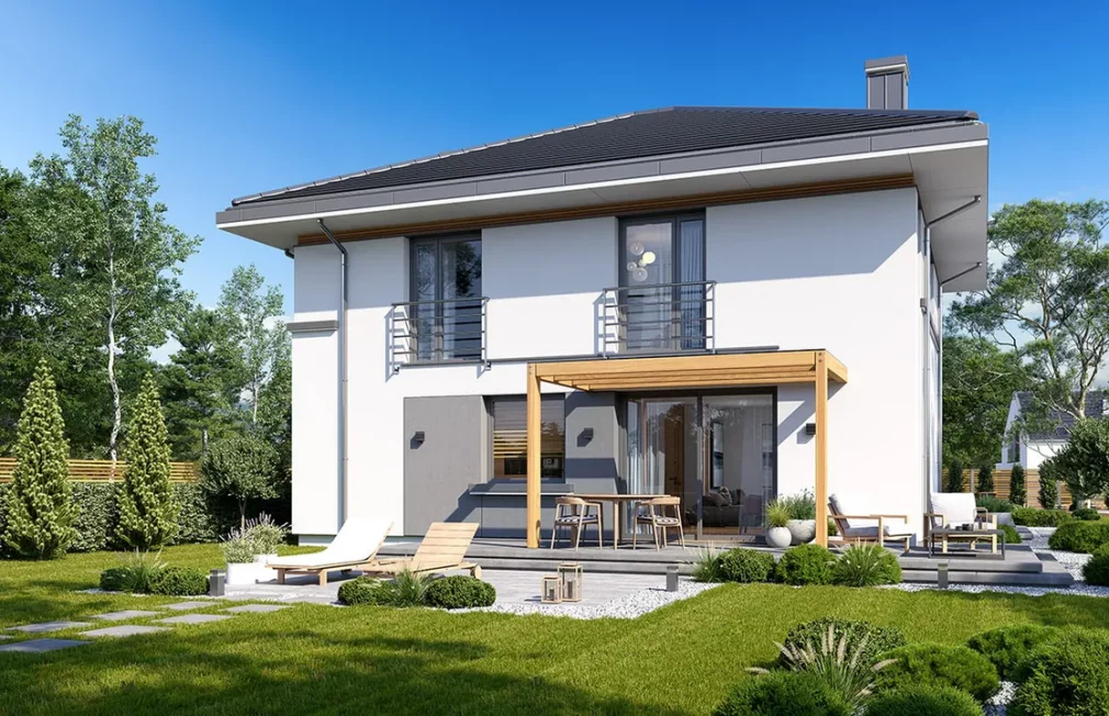 Внутреннее пространство первого этажа организовано как единая светлая территория для жизни. Просторная гостиная, совмещенная со столовой, имеет окна, ориентированные на три стороны света, что гарантирует великолепное естественное освещение. Для тех, кто планирует двухэтажный каркасный дом под ключ, данный проект станет находкой благодаря своей технологичности и продуманной планировке: на нижнем уровне также разместились полуоткрытая кухня с кладовой и технический блок. Со стороны сада предусмотрен панорамный выход на уютную террасу с перголой, расширяющей жилую зону.