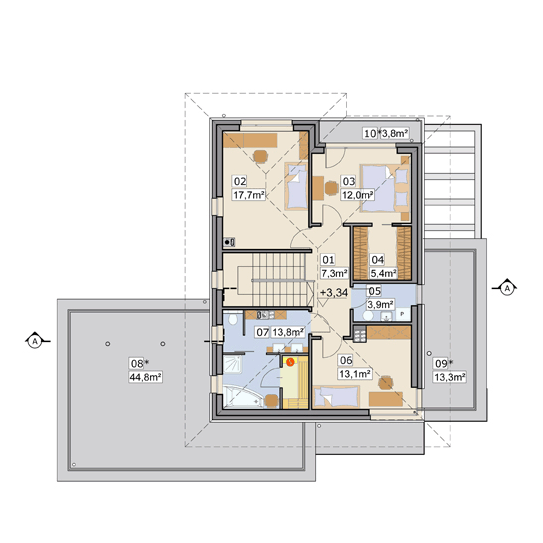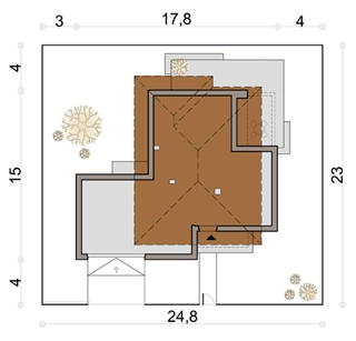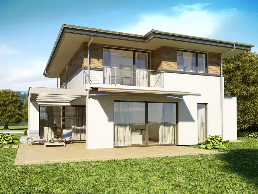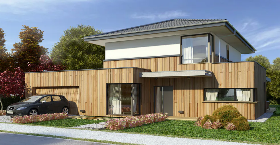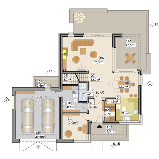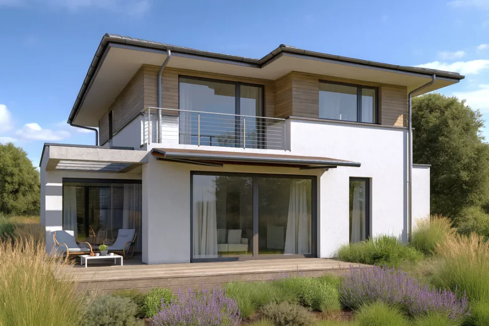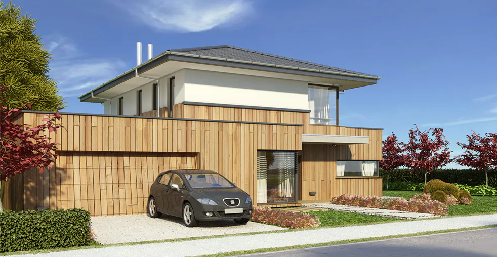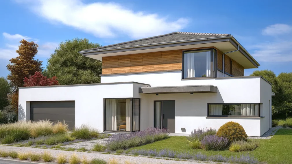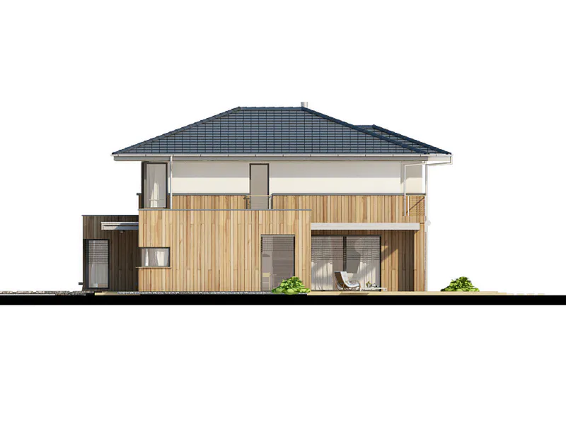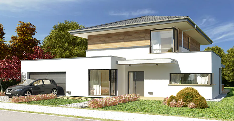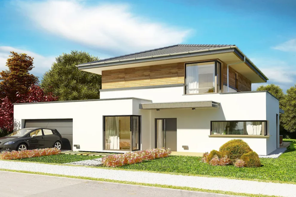 Проект AET-250 — это архитектурное решение для тех, кто ищет масштабное и статусное жилье. Здание имеет оригинальную L-образную форму, которая не только придает экстерьеру выразительность, но и позволяет грамотно зонировать придомовую территорию. Четырехскатная вальмовая кровля обеспечивает высокую устойчивость к погодным нагрузкам, а встроенный двухместный гараж подчеркивает современный уровень комфорта. Этот двухэтажный дом станет архитектурной доминантой любого участка, сочетая в себе монументальность и изящество отделки.
