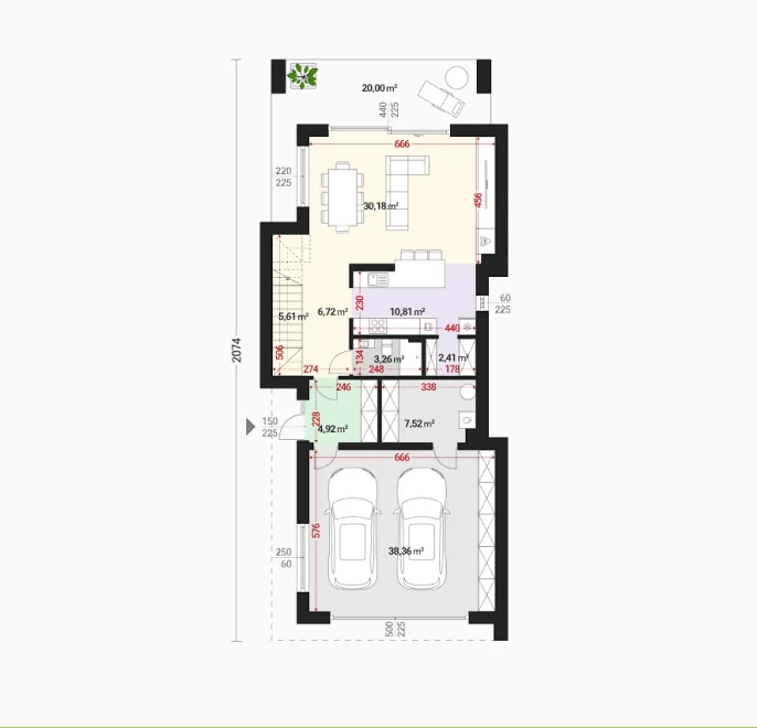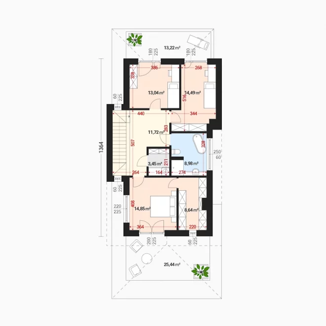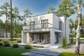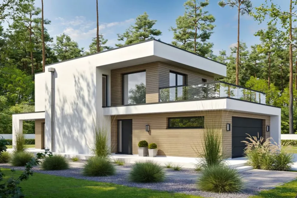 Проект AET-251 — это воплощение прогрессивной архитектуры, созданное специально для узких участков. Благодаря плоской кровле и лаконичной геометрии, этот двухэтажный дом выглядит невероятно стильно и актуально. Фасад, сочетающий белоснежные поверхности, теплое натуральное дерево и легкие стеклянные ограждения террас, формирует образ престижного жилья будущего. Компактная форма здания не только подчеркивает его эстетику, но и обеспечивает превосходные теплотехнические характеристики, снижая затраты на отопление.