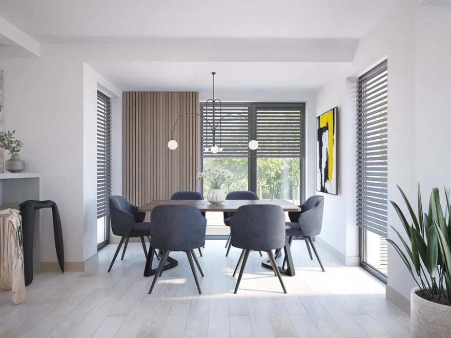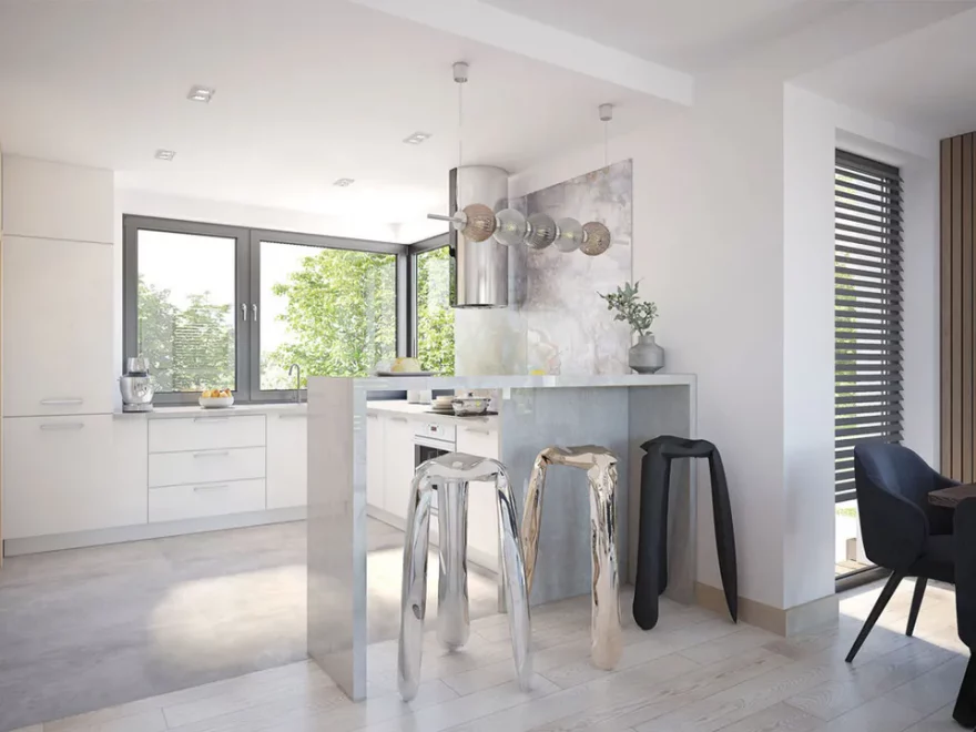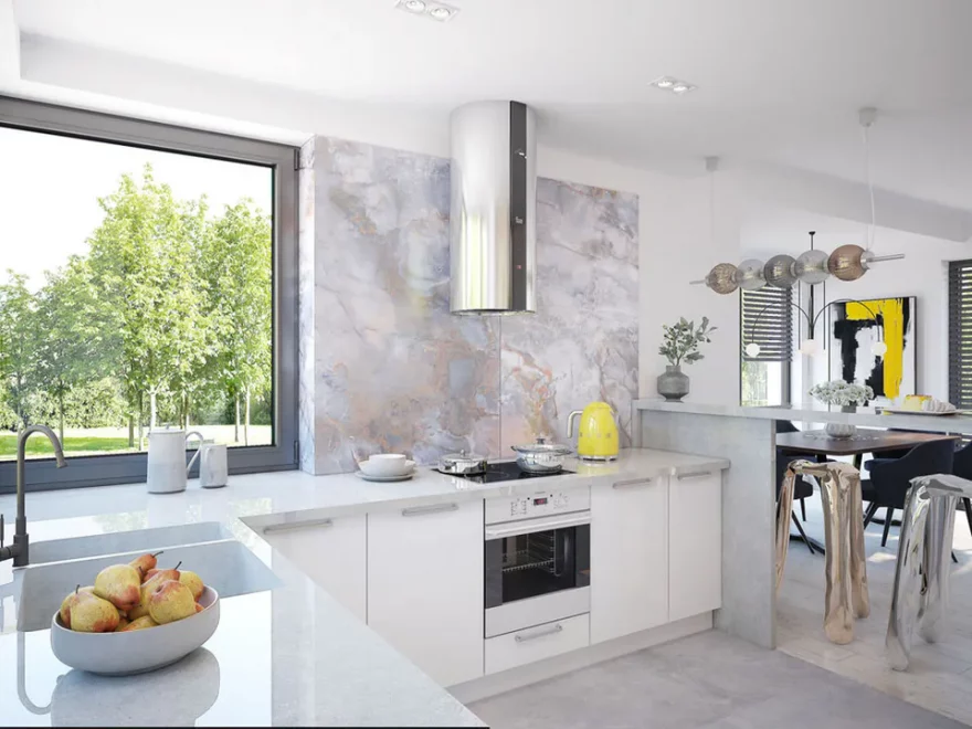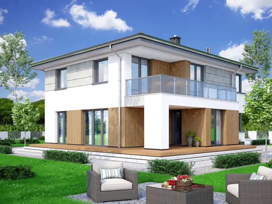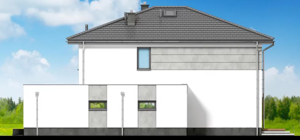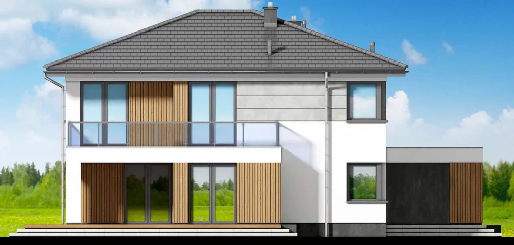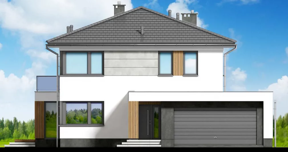 Проект AET-254 — это воплощение стиля и современной классики в загородном строительстве. Выразительный архитектурный облик здания создается за счет сложной игры фасадных материалов и эффектных геометрических форм. Этот двухэтажный дом спроектирован для тех, кто ищет не просто жилье, а статусную резиденцию с просторными интерьерами, производящими сильное впечатление. Встроенный двухместный гараж и массивная кровля подчеркивают монументальность постройки, а крытая входная веранда добавляет фасаду гостеприимства.